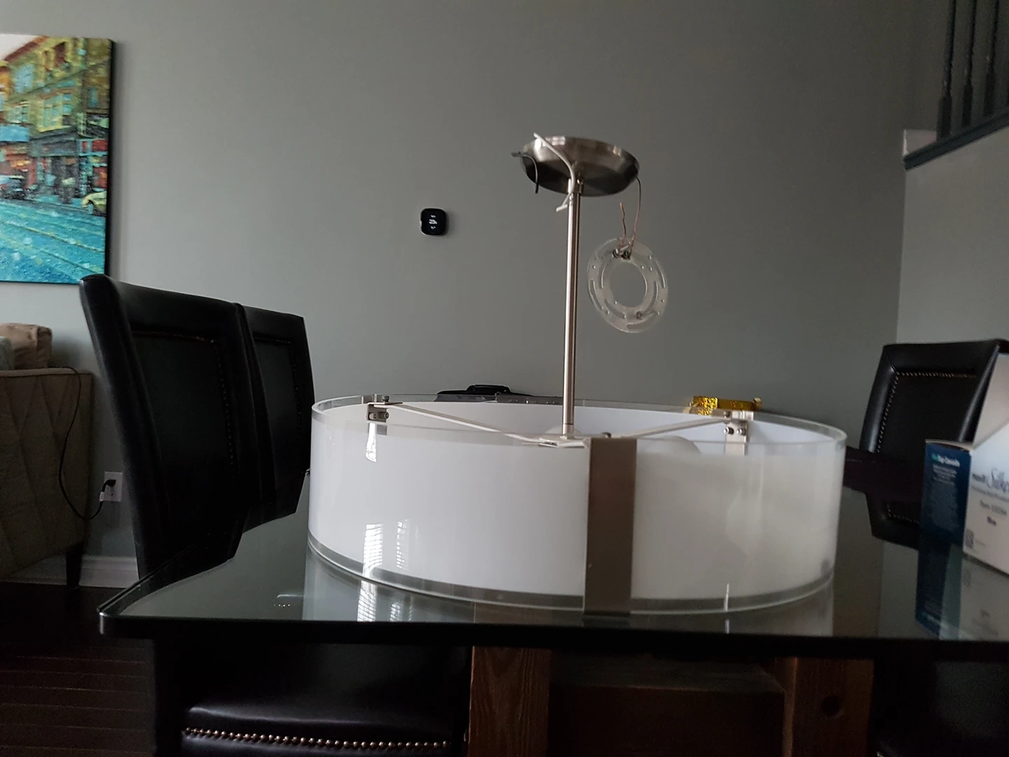 Stainless steel and glass light. Measures 20x5 inches. Stainless steel hanging bar height is adjustable. I also have a second identical one - see other posting. $15 for one or $25 for two. Negotiable.