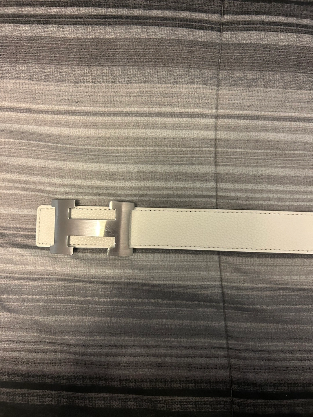 128Men's off-white leather belt. Silver-toned H-shaped buckle. Looks like new. UA rep