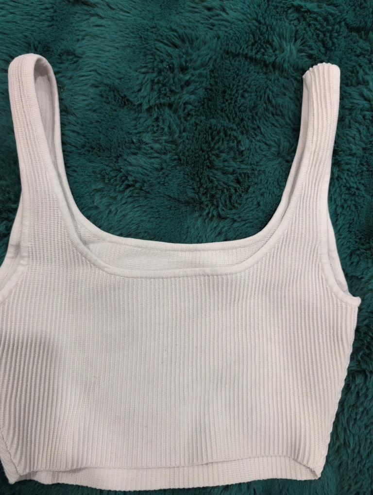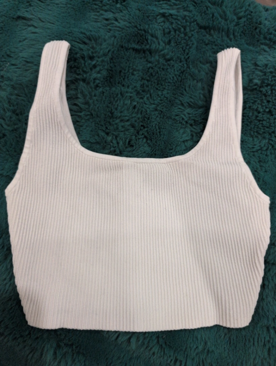982Super chic cream-coloured stretchy ribbed knit crop tank top. Scoop neck. Lightweight material.