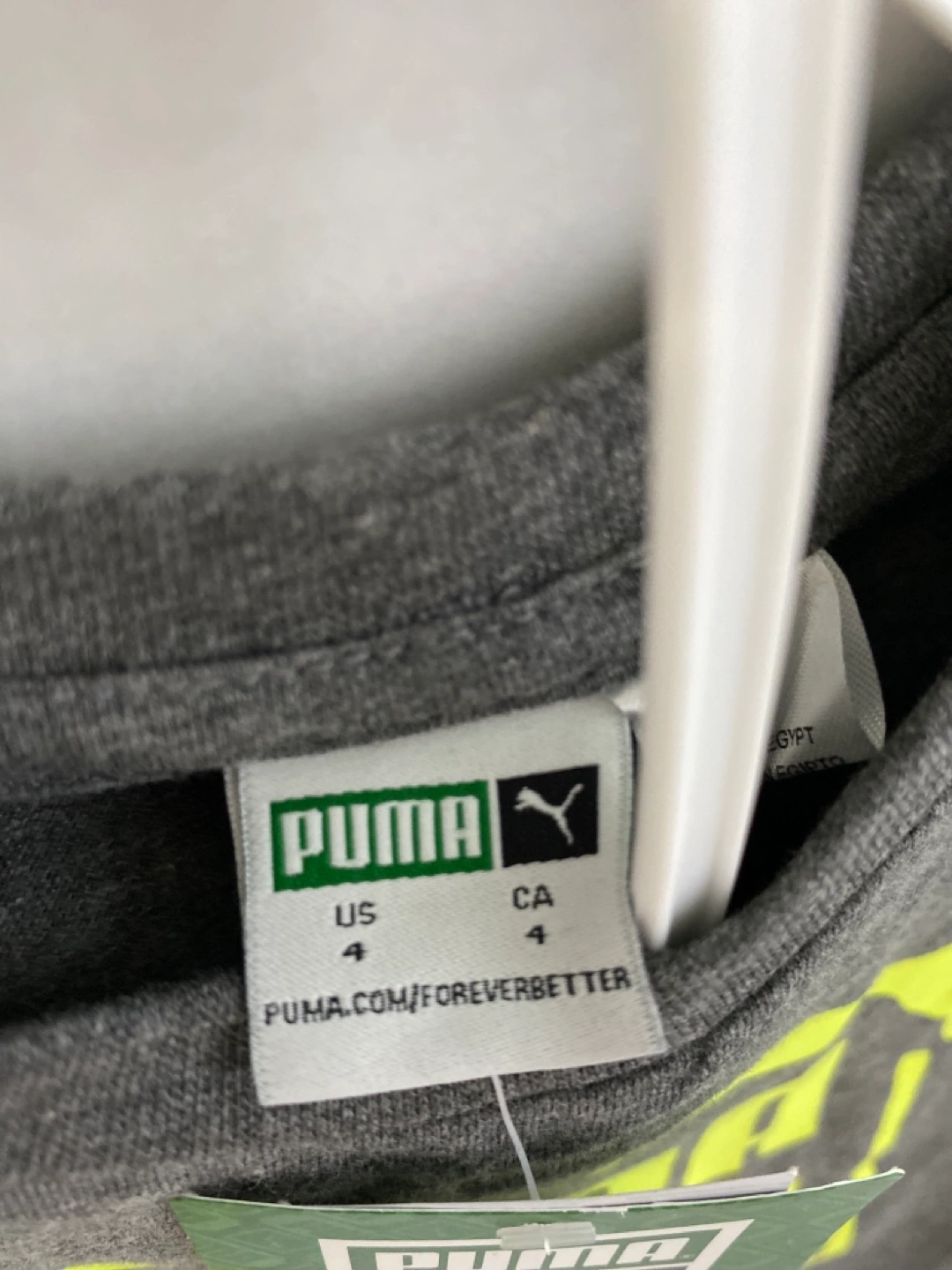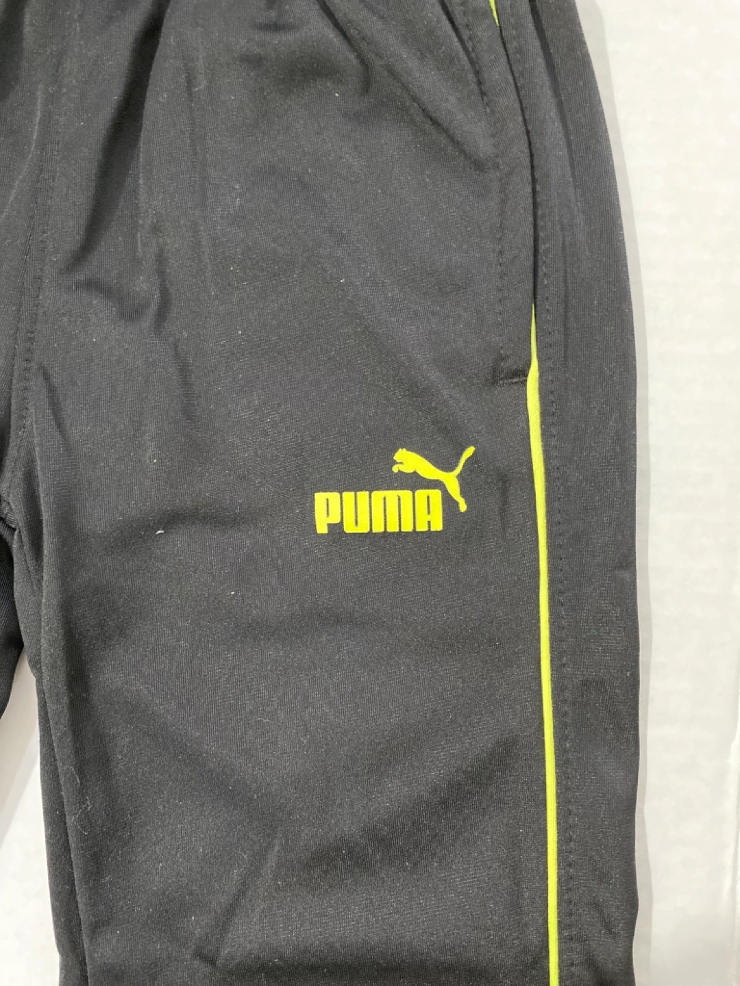 Adorable Puma tracksuit for boys. Gray long-sleeve shirt features a yellow Puma logo. Black sweatpants with yellow stripes. Great for playtime or lounging.