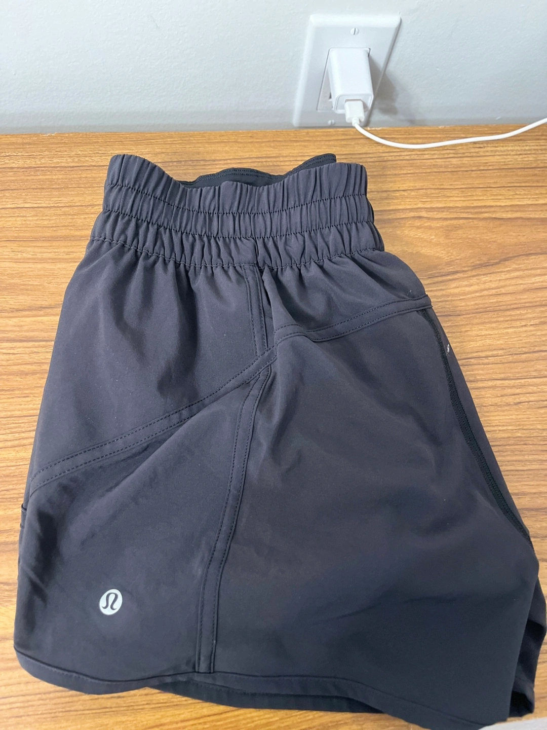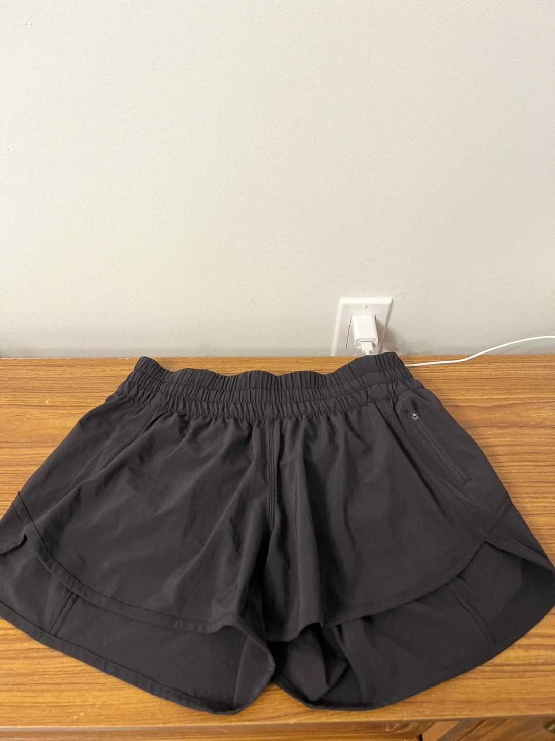 Lululemon running shorts. Size 10. Dark grey colour. Elastic waistband. Small side pocket.