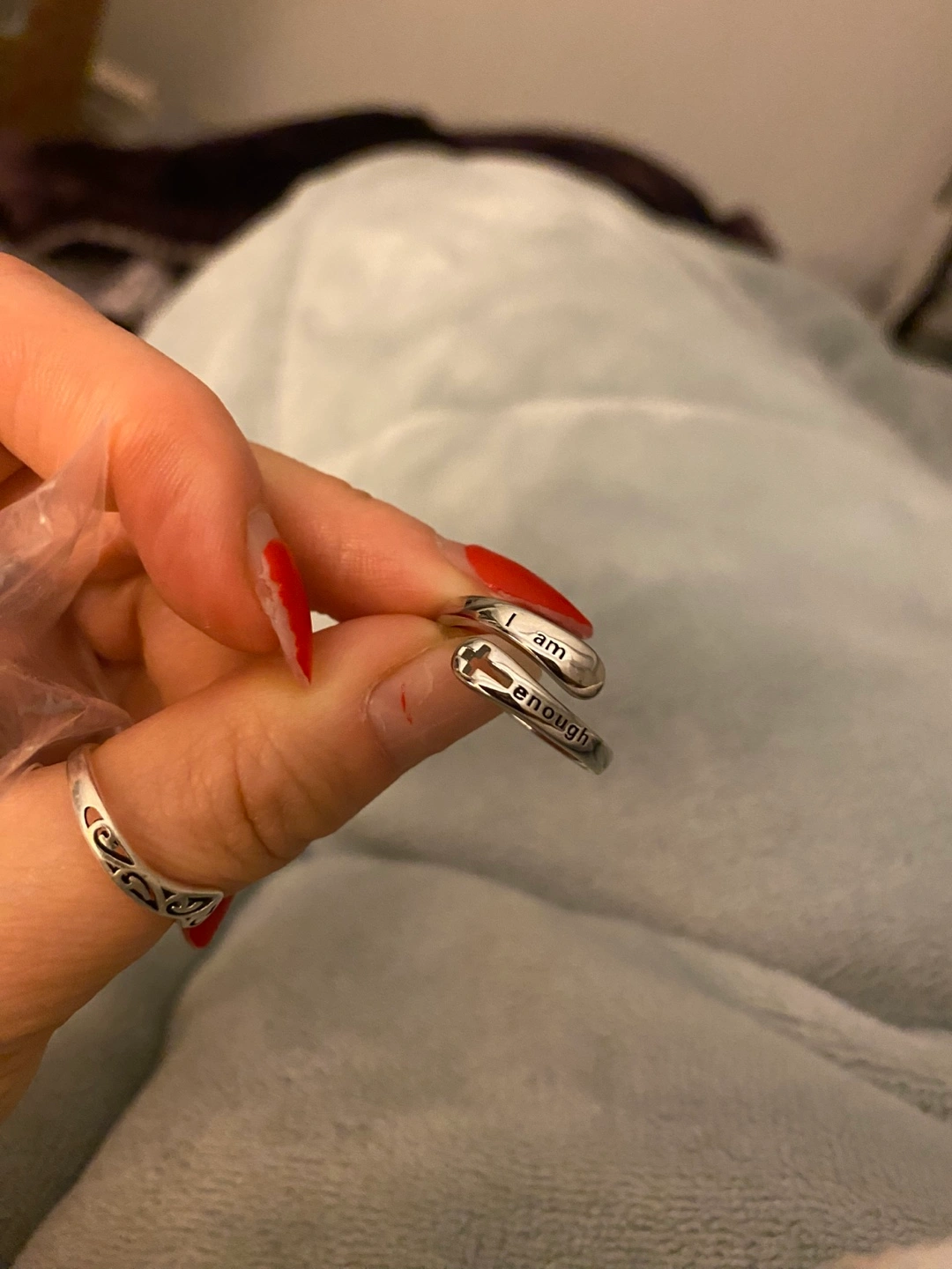 Sterling silver 925 adjustable ring. Features the inscription "I am enough" and a small cross. 925 stamped. Faith inscription on inside.