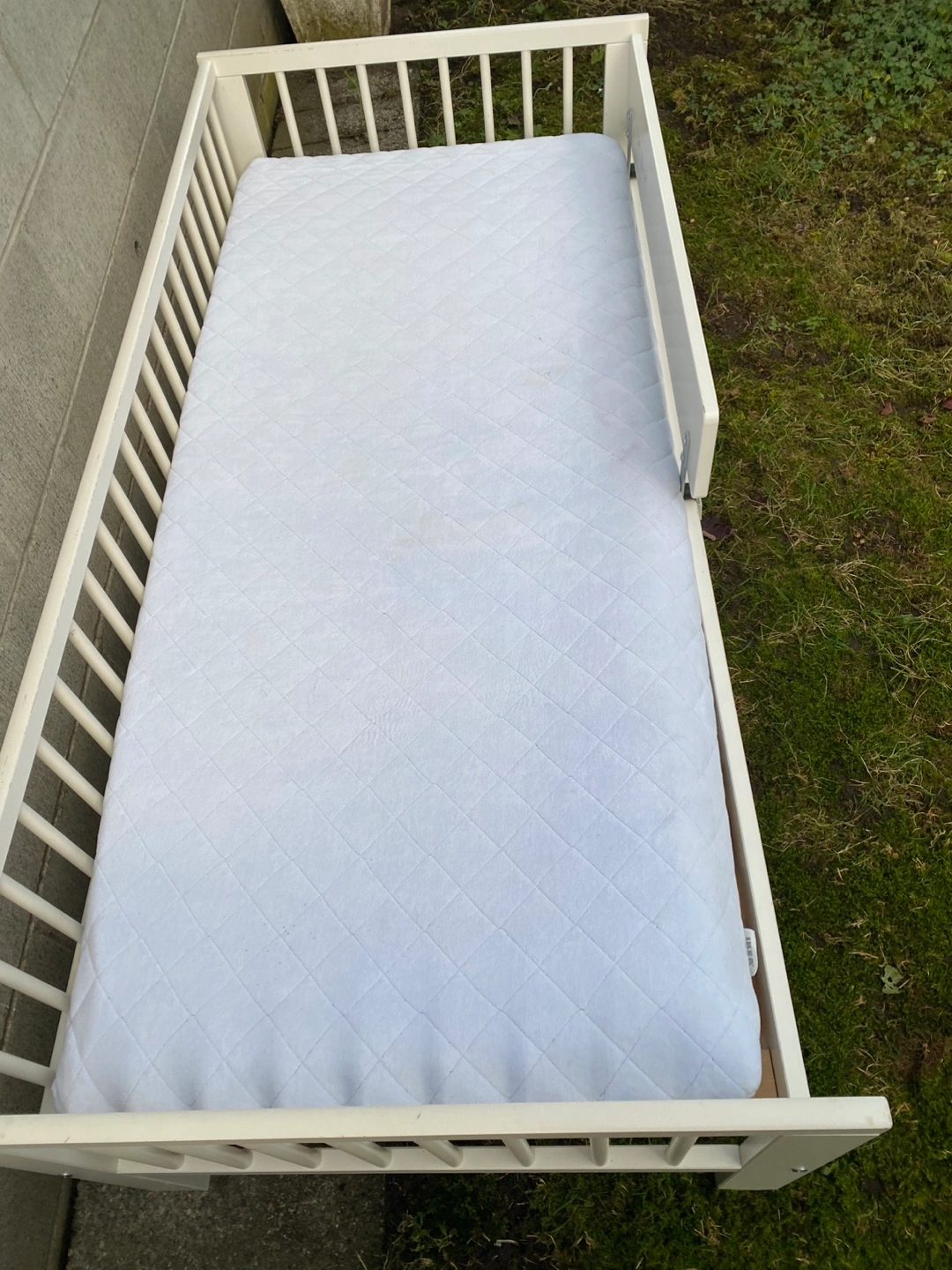 IKEA Sultan Lade toddler bed with guard rail. Perfect for transitioning between crib and twin bed. Provides a sense of comfort and safety while being a “big kid”.