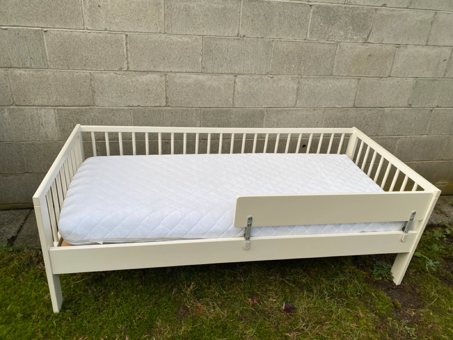 IKEA Sultan Lade toddler bed with guard rail. Perfect for transitioning between crib and twin bed. Provides a sense of comfort and safety while being a “big kid”.