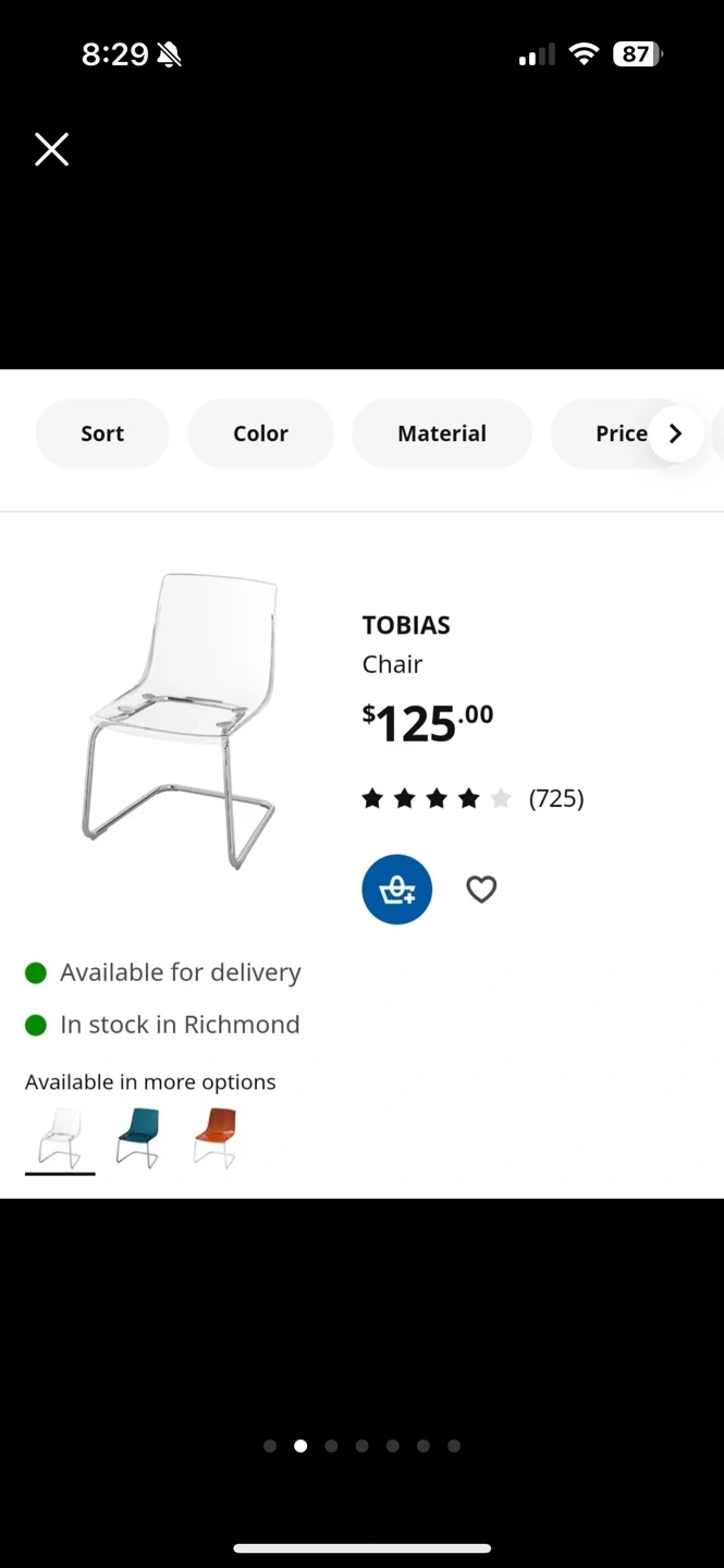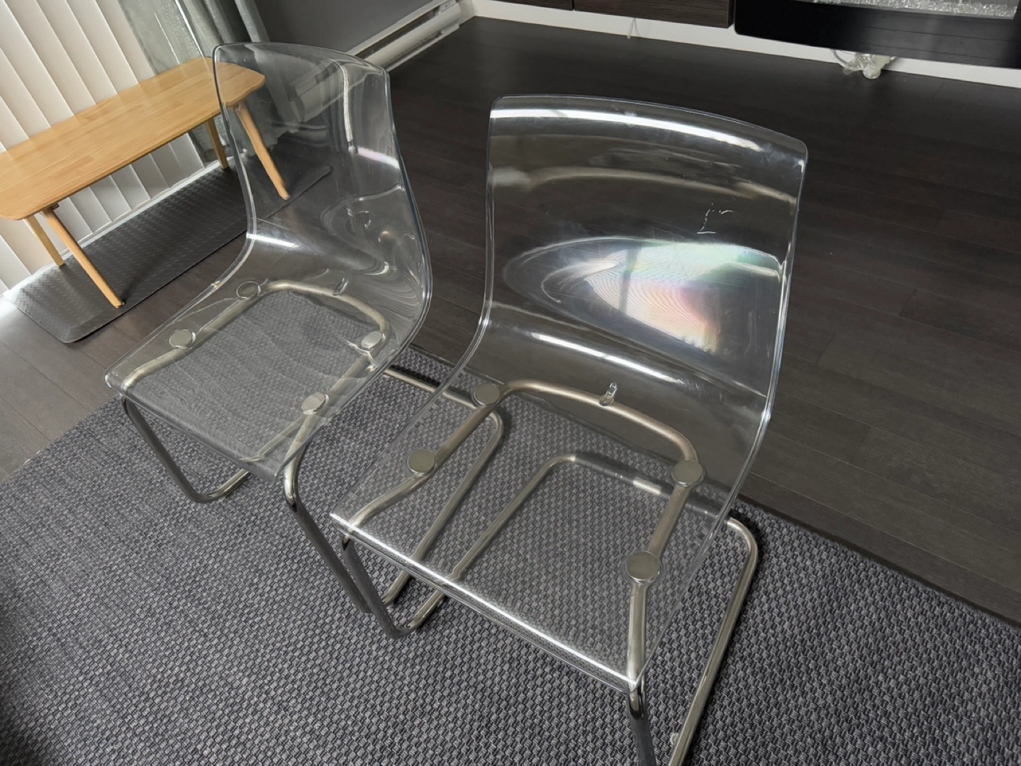 Set of two Tobias chairs. Thick clear plastic seats with chrome legs. Modern design. Good for dining or extra seating.