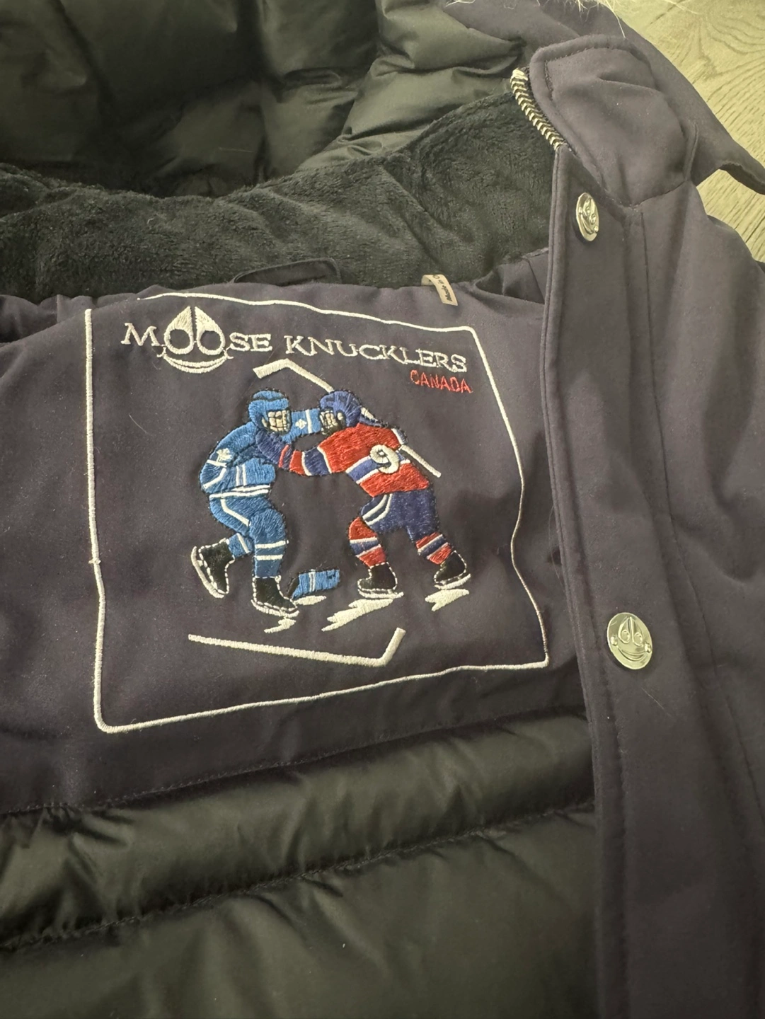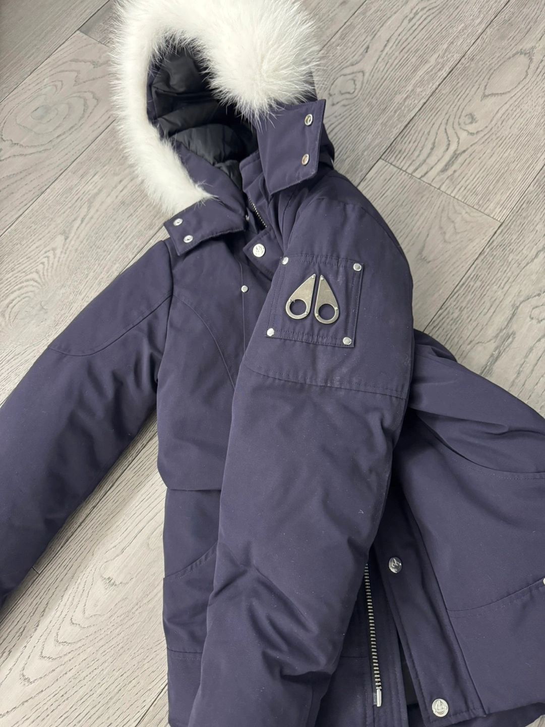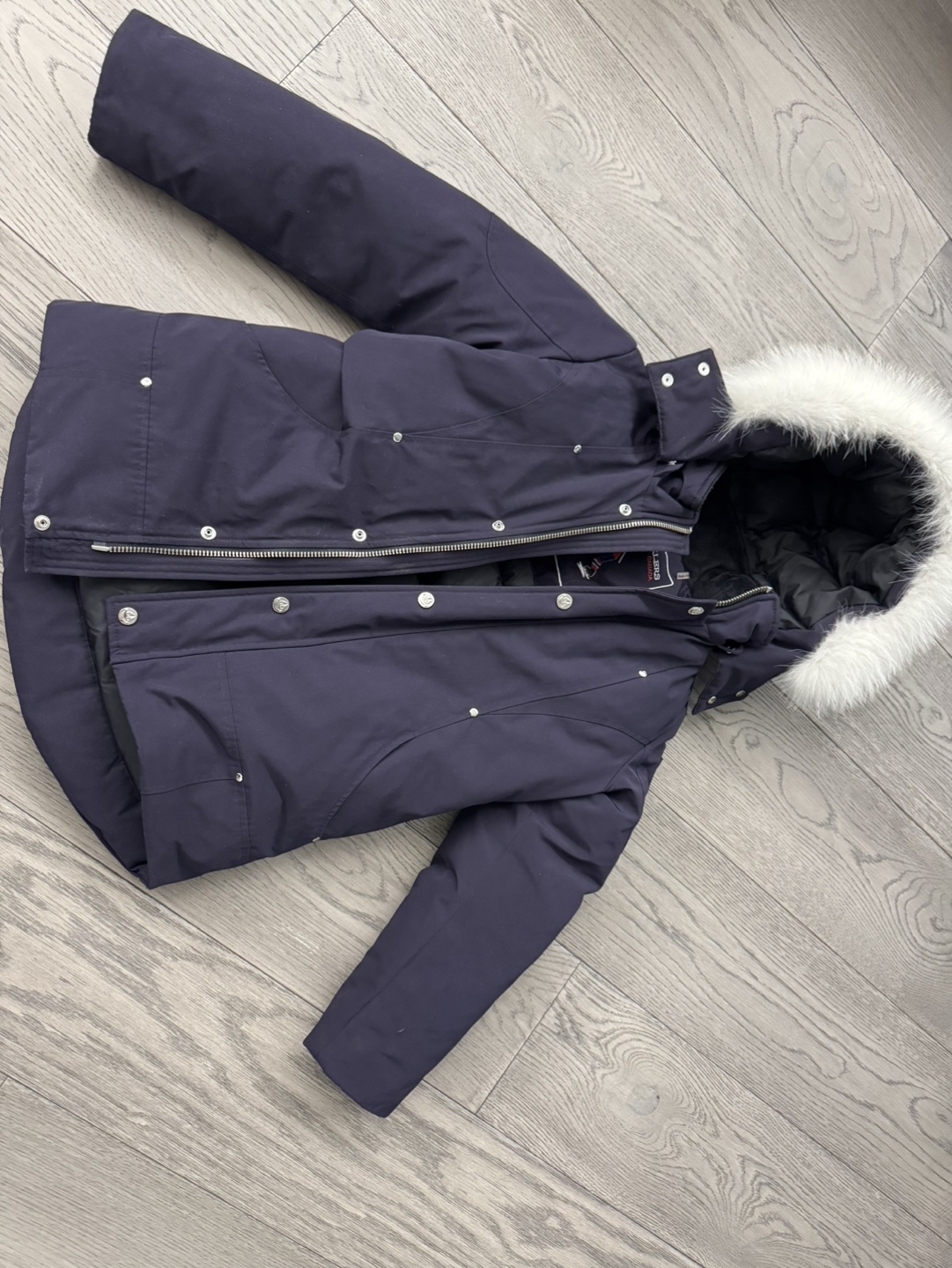 Kids dark purple-blue parka. Features a faux fur trimmed hood, down fill, and signature Moose Knuckles branding. Zipper and snap closure. Excellent for cold weather.