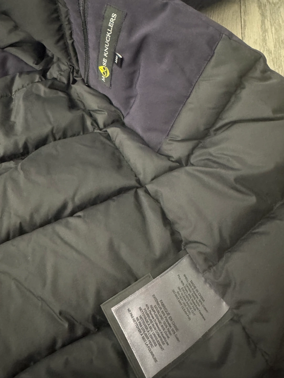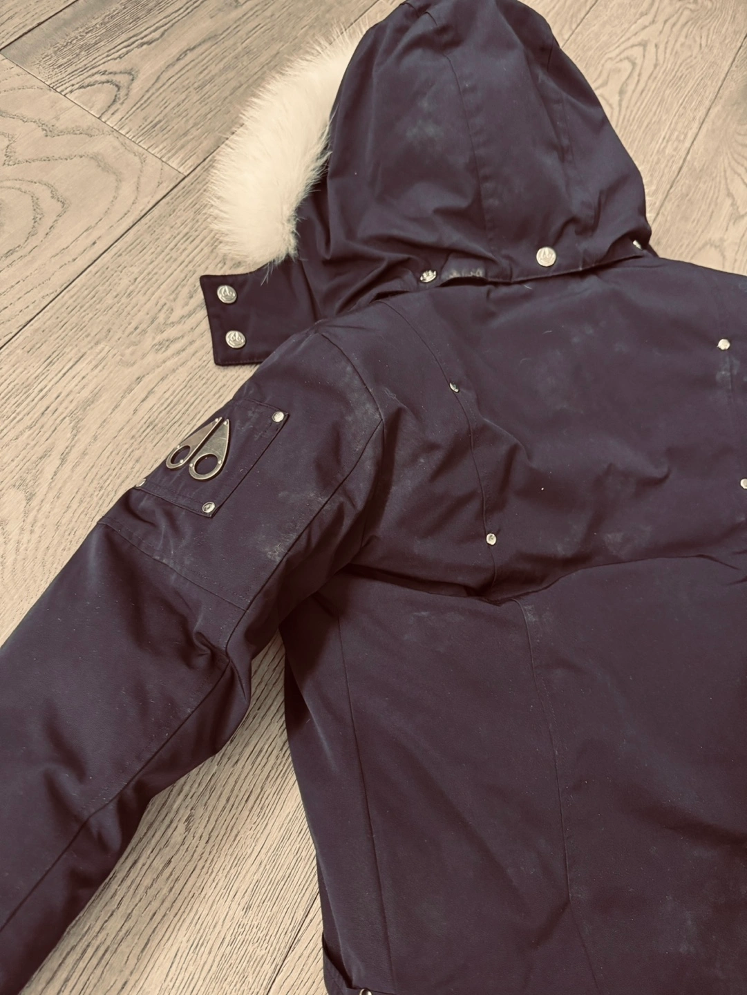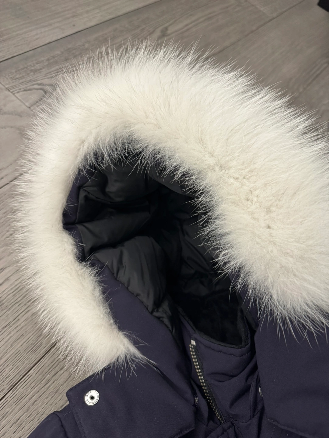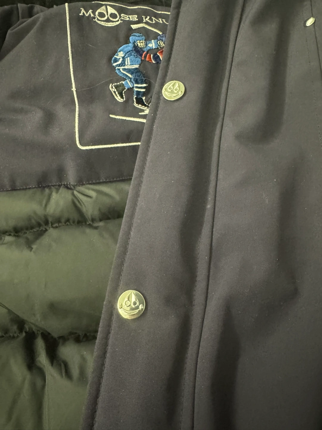 Kids dark purple-blue parka. Features a faux fur trimmed hood, down fill, and signature Moose Knuckles branding. Zipper and snap closure. Excellent for cold weather.