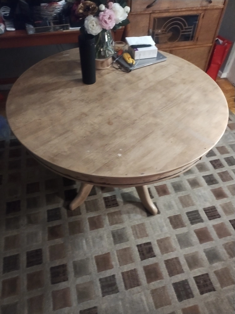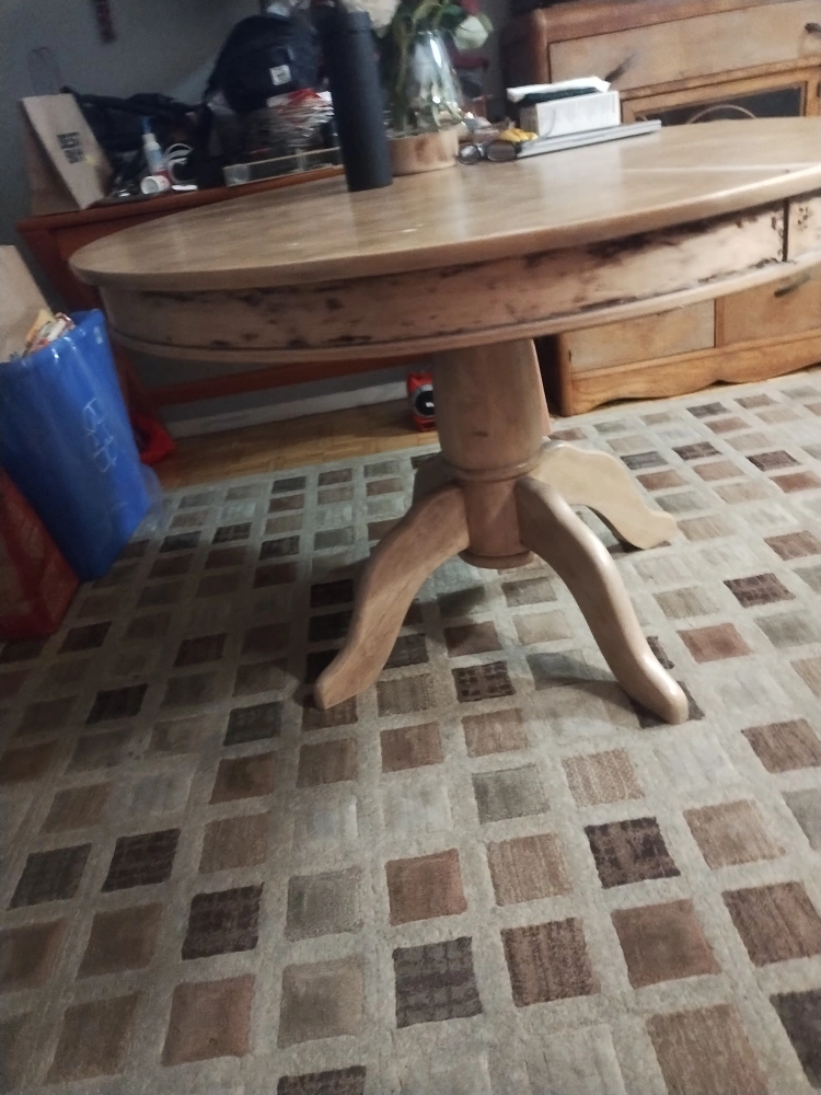 Solid wood round dining table. Pedestal base. Some minor wear. Good condition. Perfect for a small space.