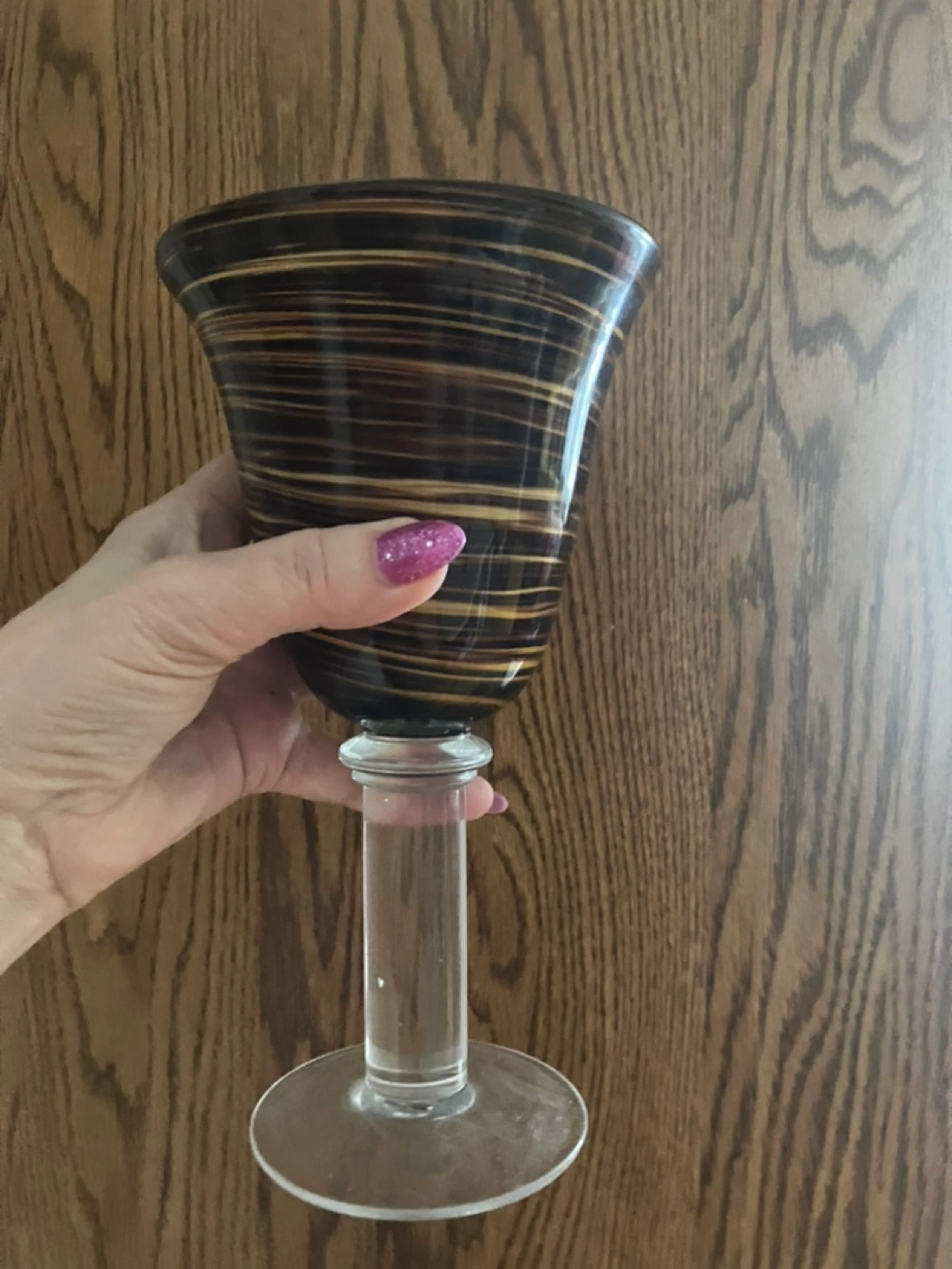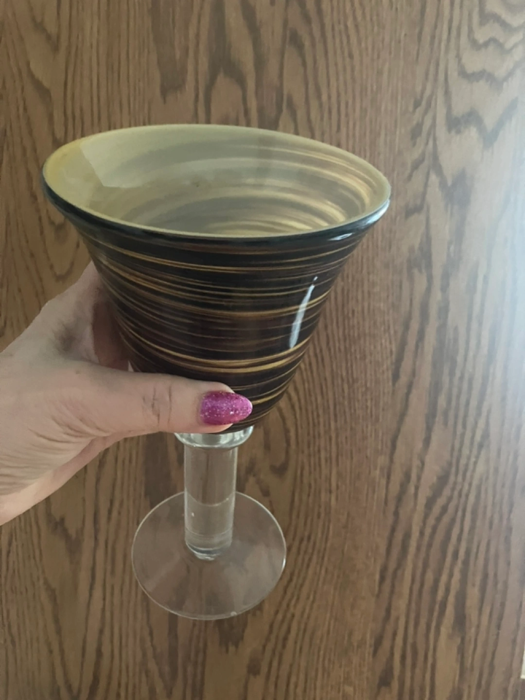 Set of four beautiful wine glasses. Features a unique swirl design in dark brown and beige. Clear glass stems and bases. Perfect for entertaining.