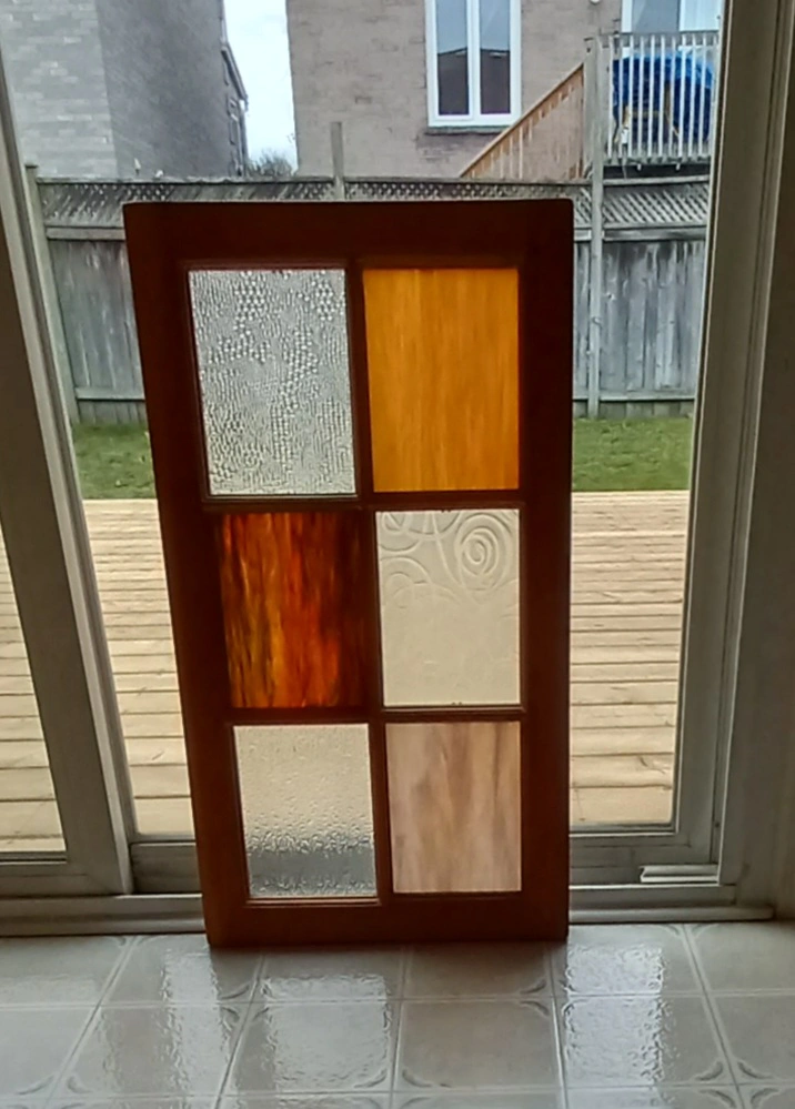 Handmade vintage refinished pine frame with added stained glass inserts. 3 textured clear glass panels and 3 multi coloured panels. Panels are approx 5.5 by 7.5 inches. Could be hung horizontal or vertical. Will add eye rings to suit buyer or take as is. Looks great in sunshine.