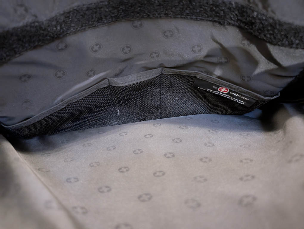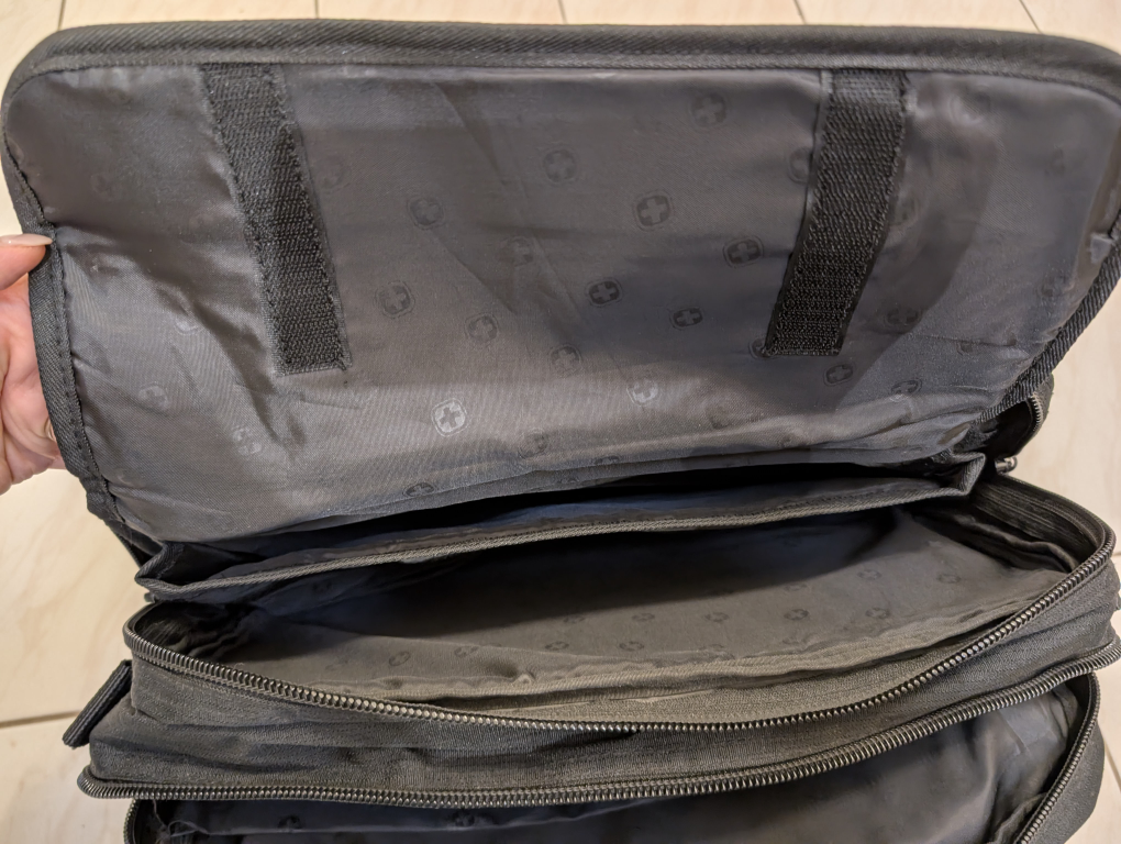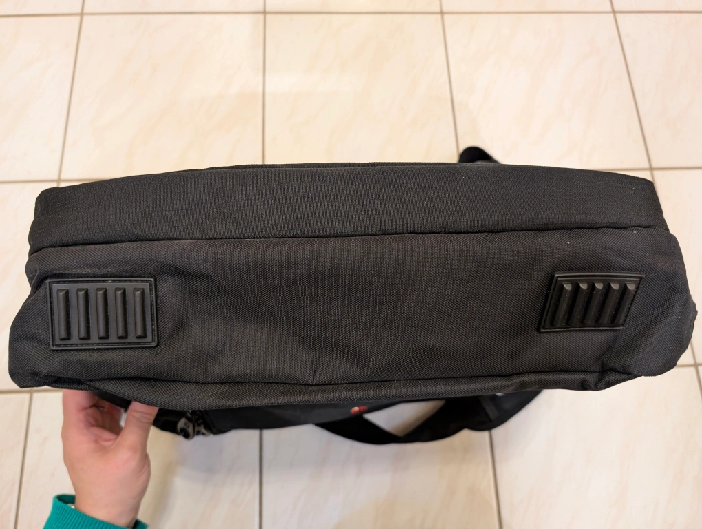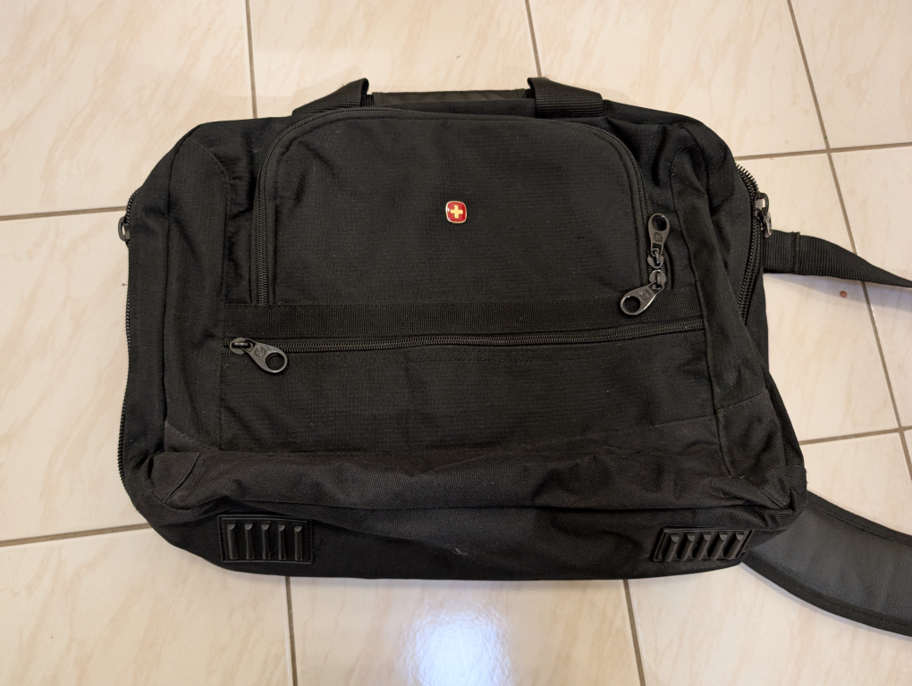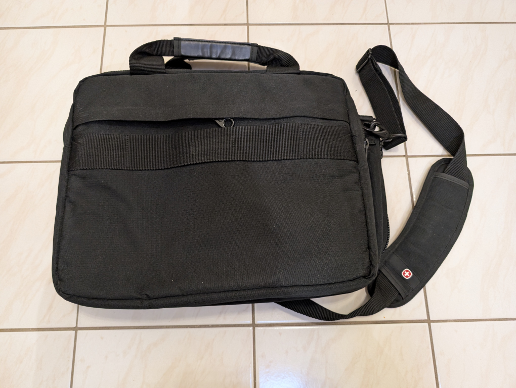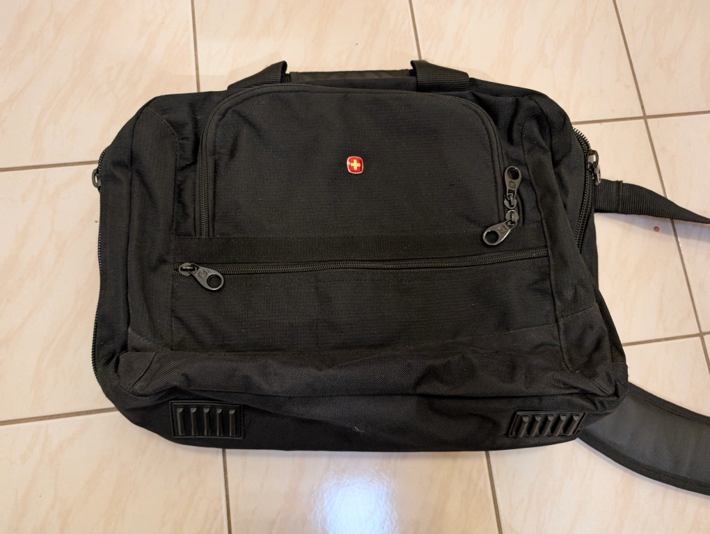 Black laptop bag. Features multiple zippered compartments. Adjustable shoulder strap and top carry handle. Durable fabric construction. Shows minor wear.