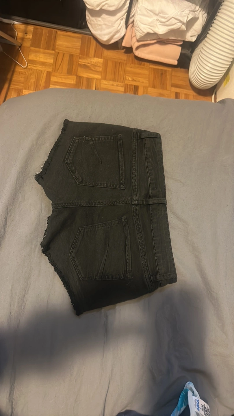Black denim shorts. Size 25. Raw hem. Five-pocket style. Button and zipper closure.
