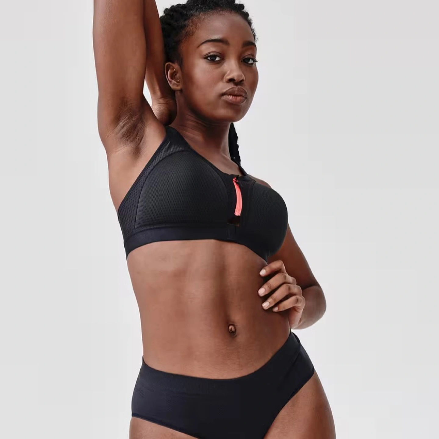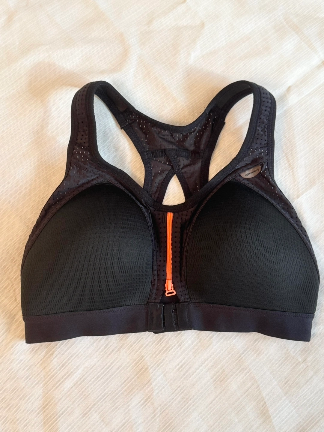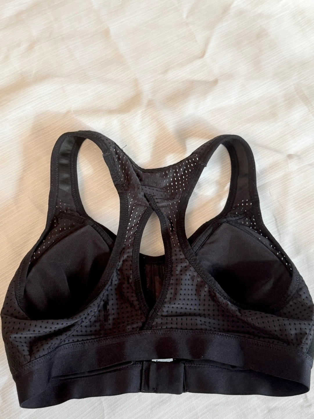 Black sports bra with zipper closure. Features mesh panels for breathability. Racerback style. Good support. Worn once. Now i am not suit for the size