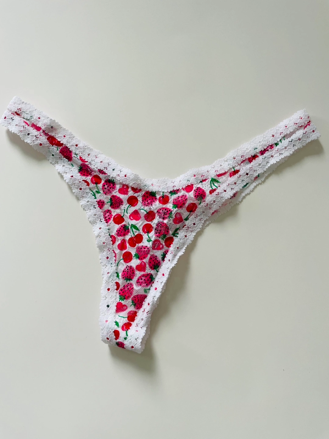 White thong with red cherry and strawberry print. Features delicate white lace trim. Size small.
