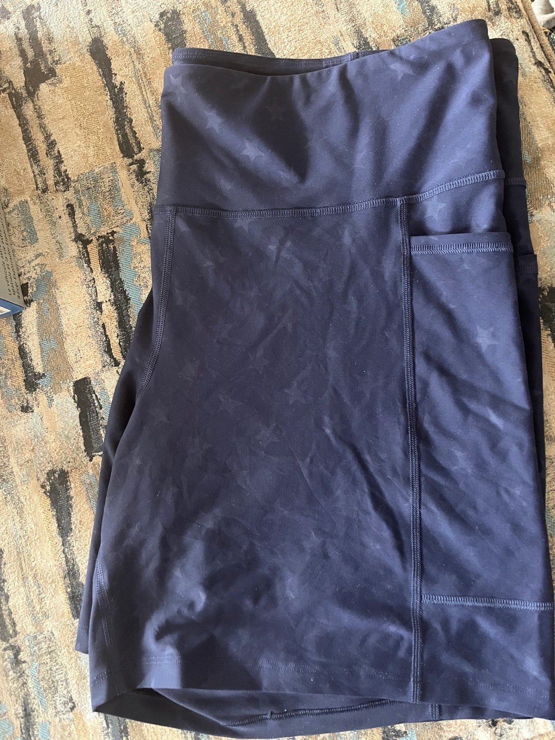 Navy blue athletic shorts. Features a high waistband and side pockets. Subtle star pattern. Plus size.