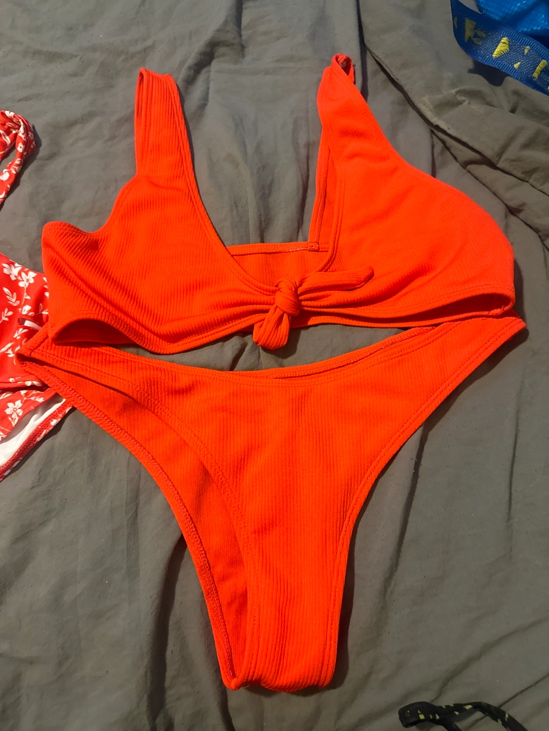 183Two orange bikinis. One floral print, one solid. Both feature a tie-front top and high-cut bottoms. Size large for all pieces. $20 each set or $40 for both sets