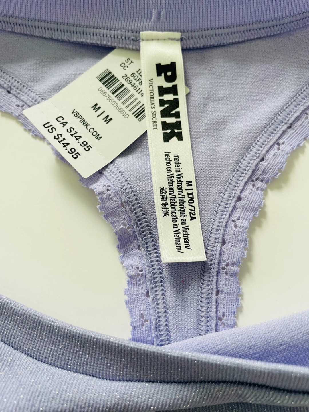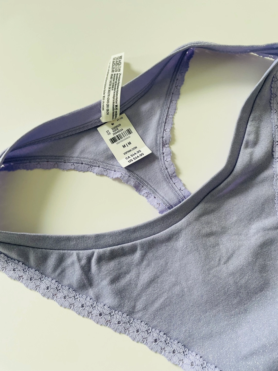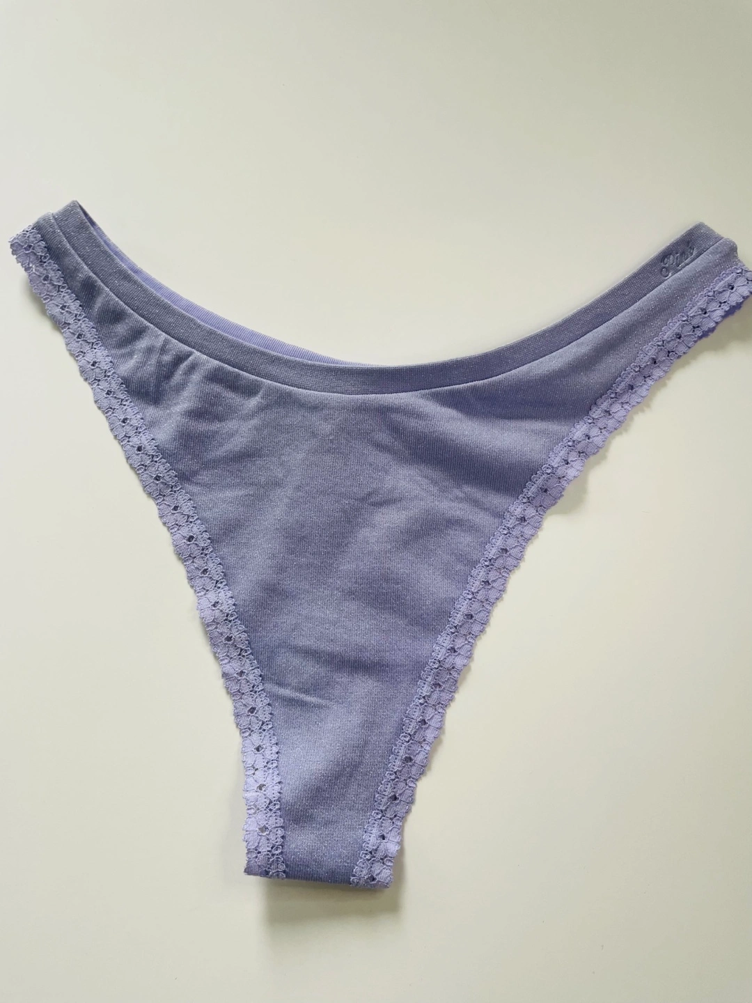Lavender coloured thong underwear. Features delicate lace trim. New with tags.