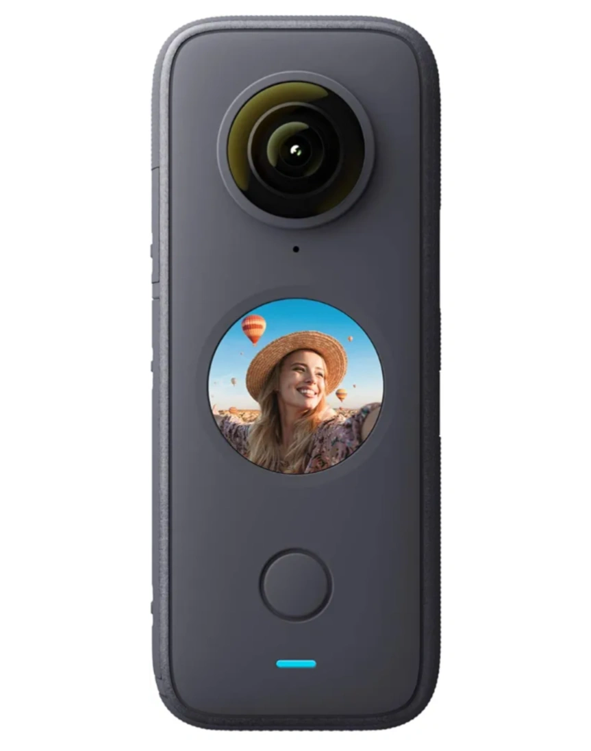Portable 360° camera. Small and lightweight design. Captures stunning 360° video and photos. Includes a circular preview screen.