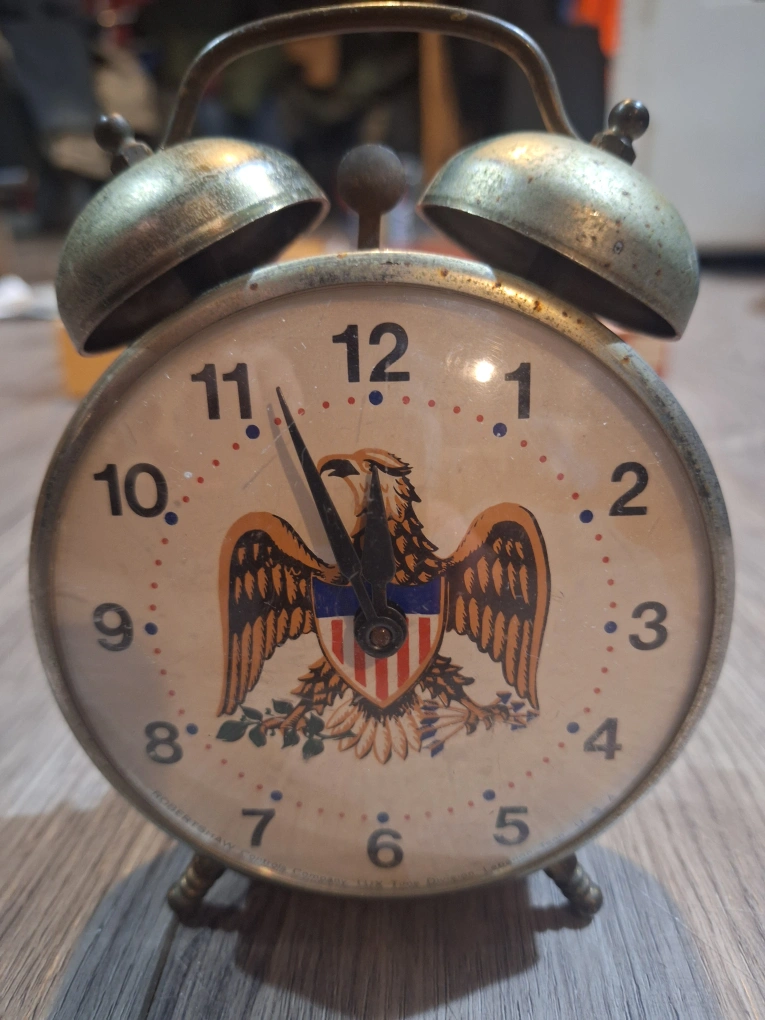 Unique vintage alarm clock. Features an American eagle design. Metal casing. Bell alarm. Shows some wear.