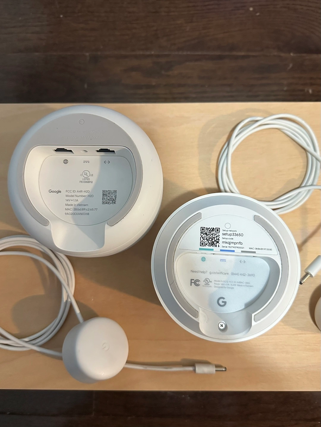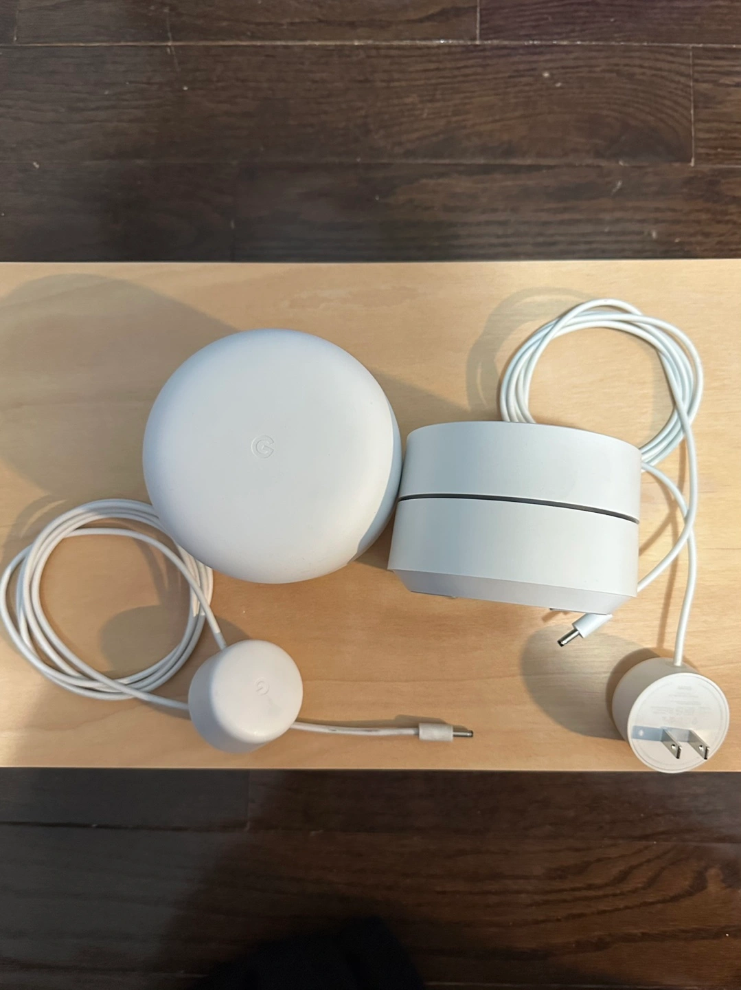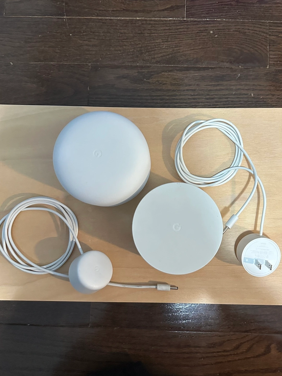 Google Nest Wifi system. Includes one router and one point. Excellent for whole-home coverage. Comes with power adapters and cables.