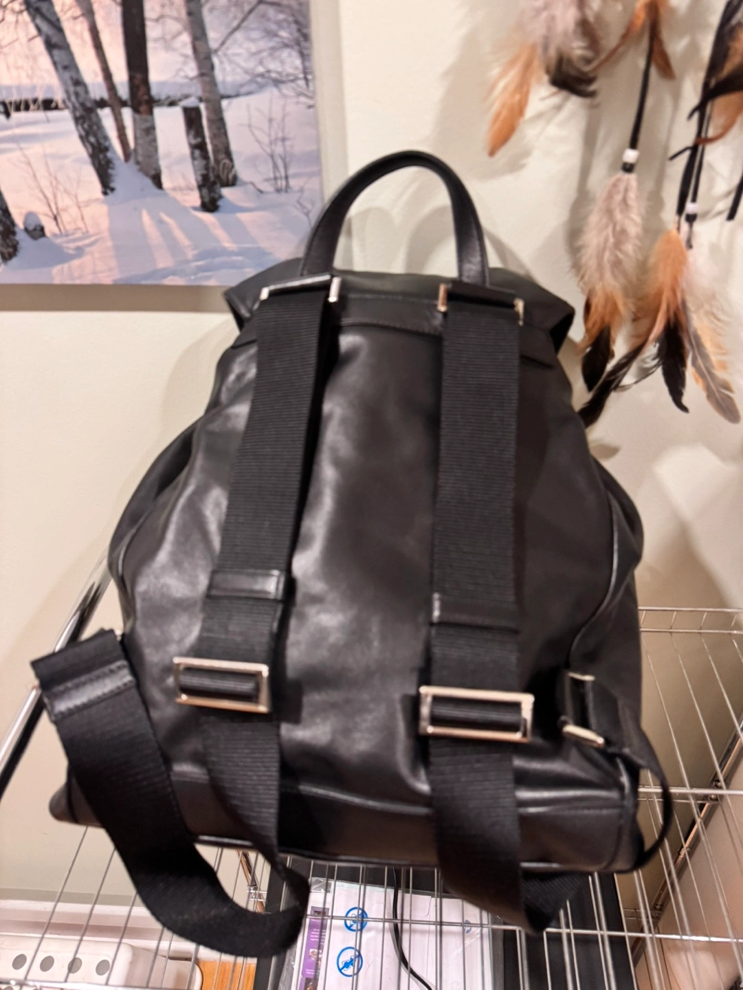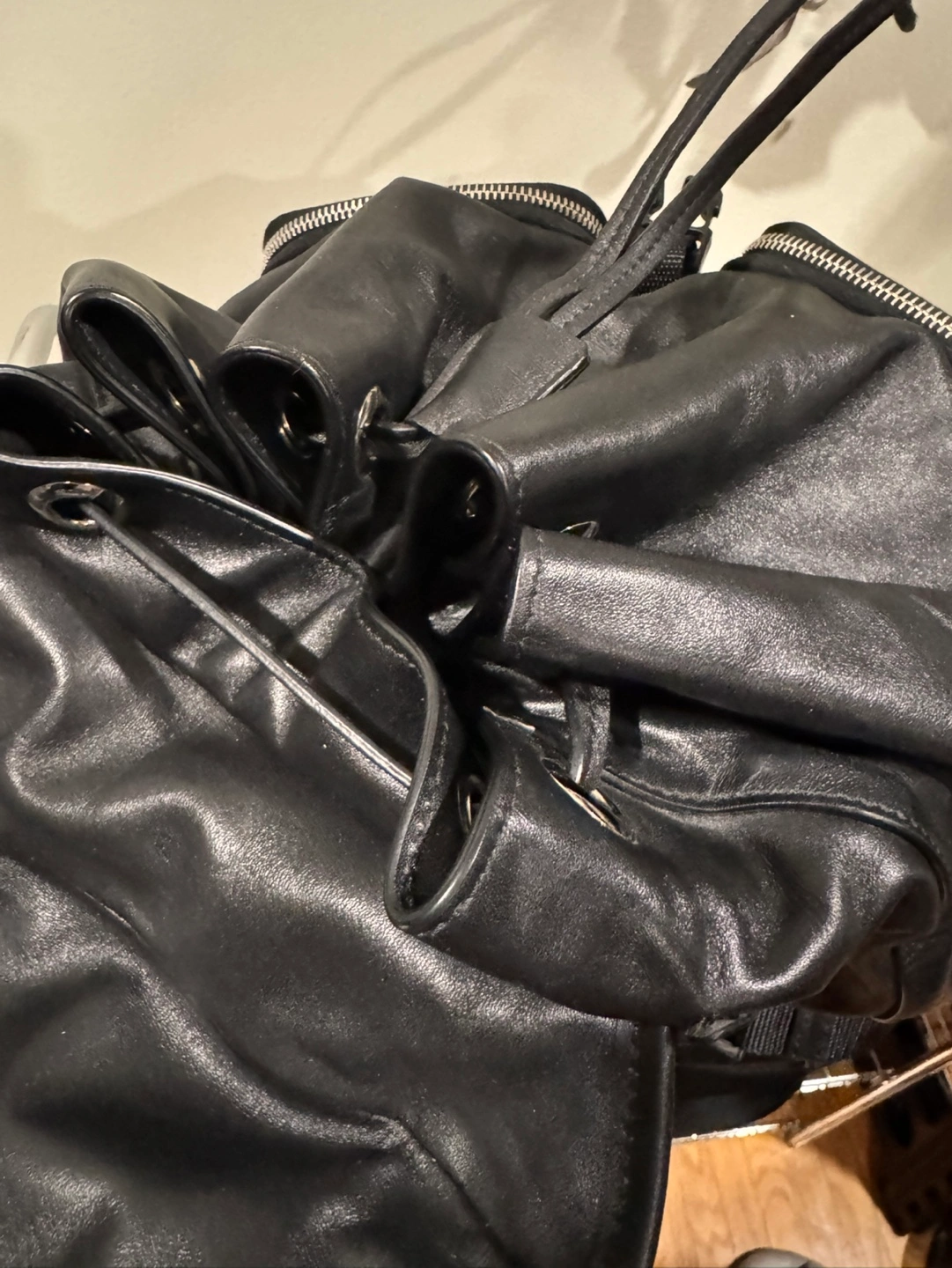Black genuine leather backpack. Features multiple pockets and adjustable straps. Drawstring closure. Excellent for everyday use.