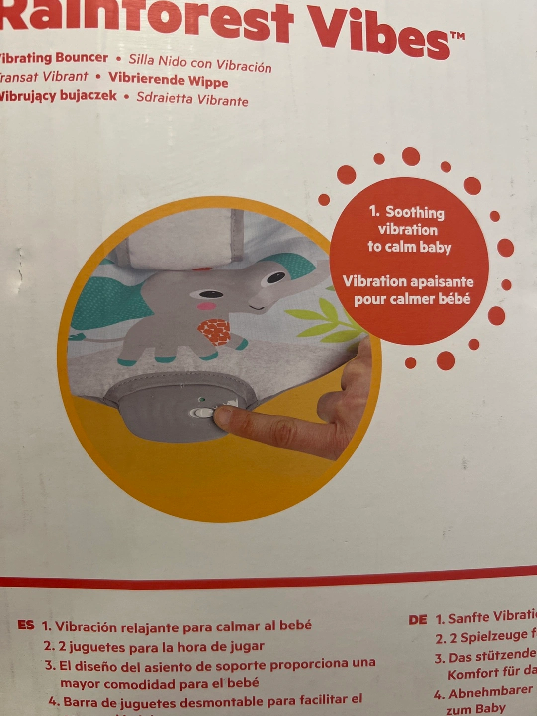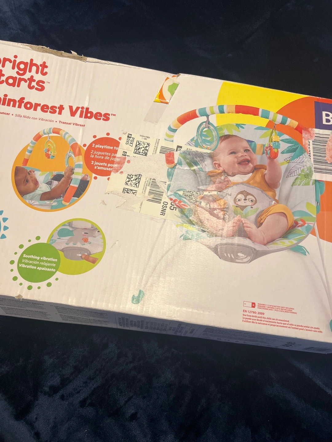 Vibrating bouncer. Features two playtime toys and a removable toy bar. Supportive seat design. Easy to clean seat pad. Three-point harness keeps baby secure. Suitable for infants. Keeps baby safe and comfortable (totally new) just opened.