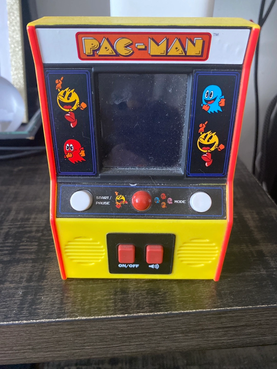 170Retro handheld Pac-Man game. Yellow and red plastic casing. Features iconic Pac-Man characters. Includes start, pause, and mode buttons. On/off switch and volume control.
