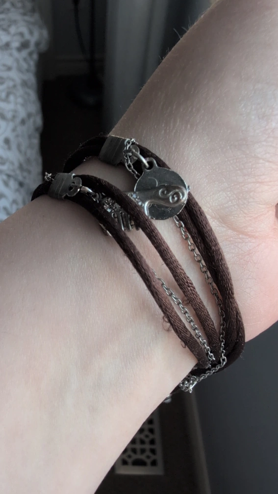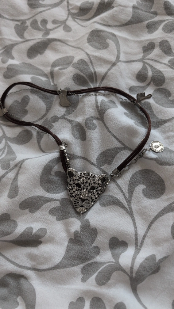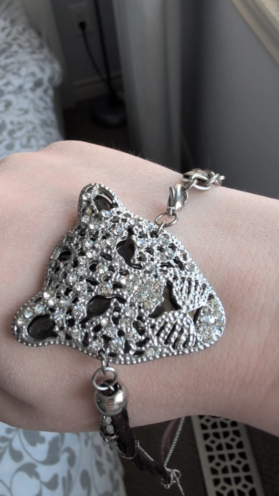 Beautiful silver jaguar head bracelet. Features small charms. Brown strap and silver chains.