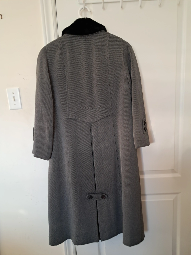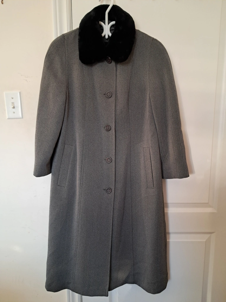 Women's grey coat, size 6. Features a black faux fur collar. Button front closure. Dry clean only. Sleeves are shorten!