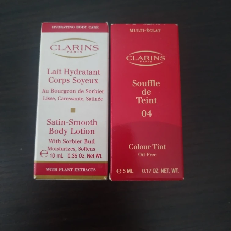 Two Clarins beauty products. Satin-Smooth Body Lotion with Sorbier Bud, moisturizes and softens. Colour Tint, oil-free. 10ml and 5ml respectively.