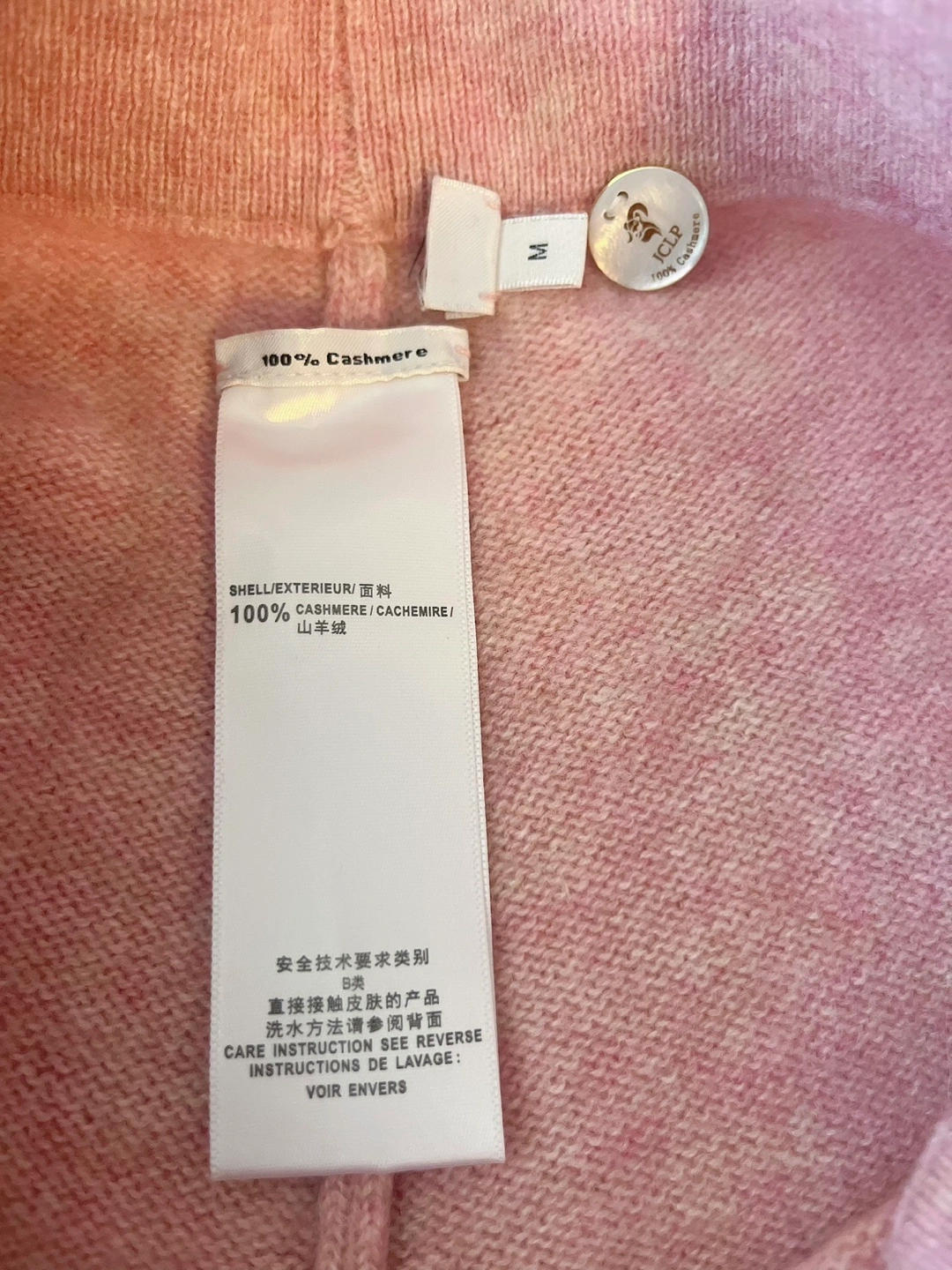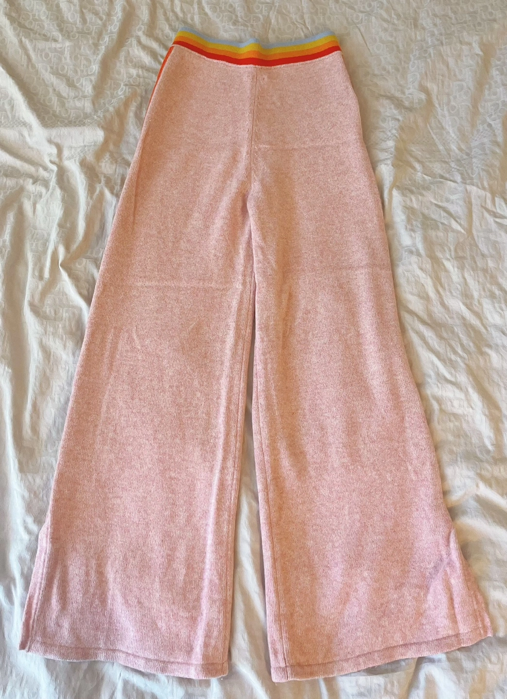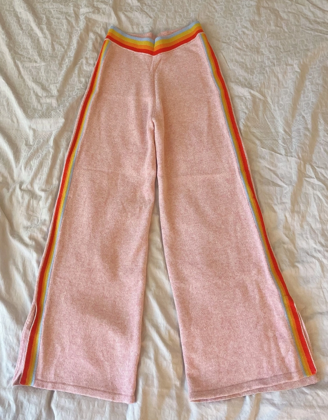 Pink cashmere wide leg pants with rainbow stripes