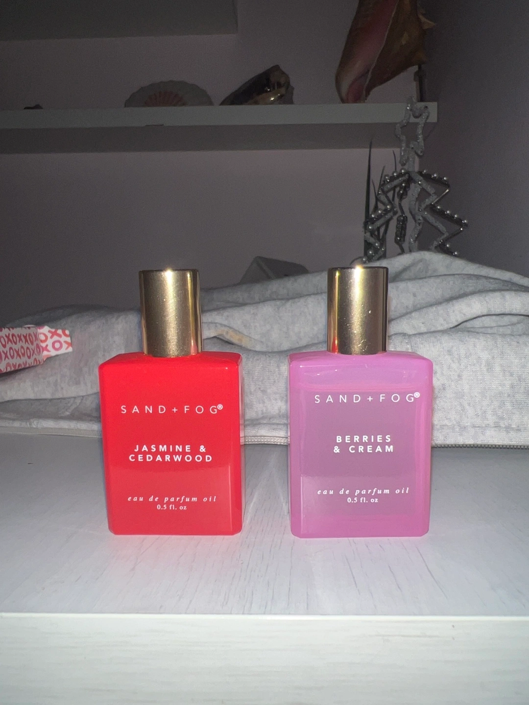 Two Sand + Fog eau de parfum oils. Jasmine & Cedarwood and Berries & Cream scents. 0.5 fl oz each. Both were opened and used only once so their still full. Bought both for 35$ + tax. Selling both for 15 or 10 for one 😶🌫️