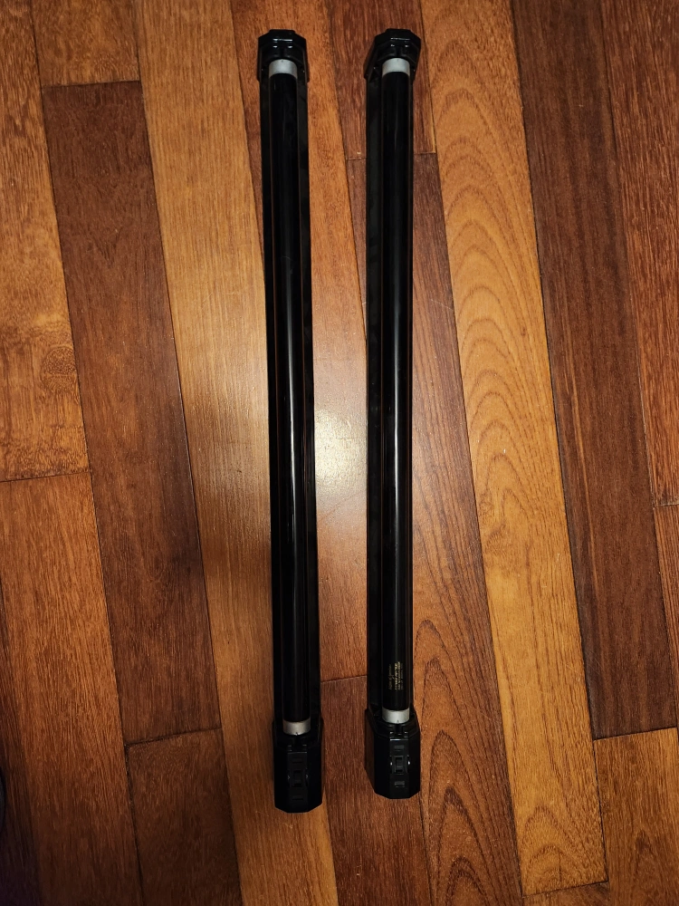 160Two black fluorescent light tubes. Perfect for a variety of applications. Sold as a pair. The light is purple and it has openings on the back to hang them.