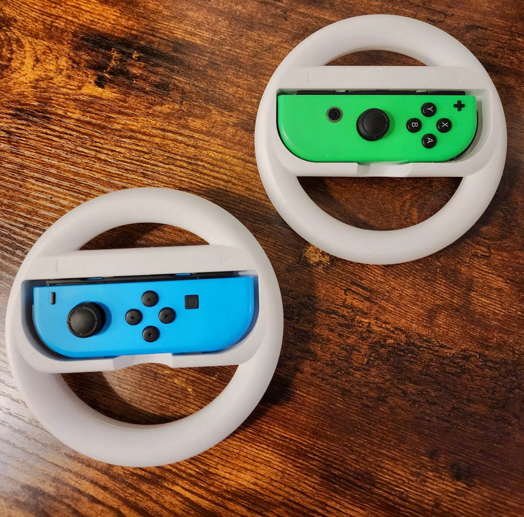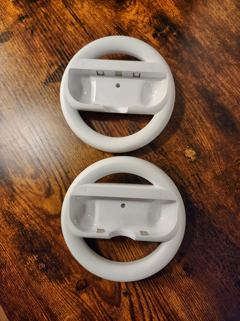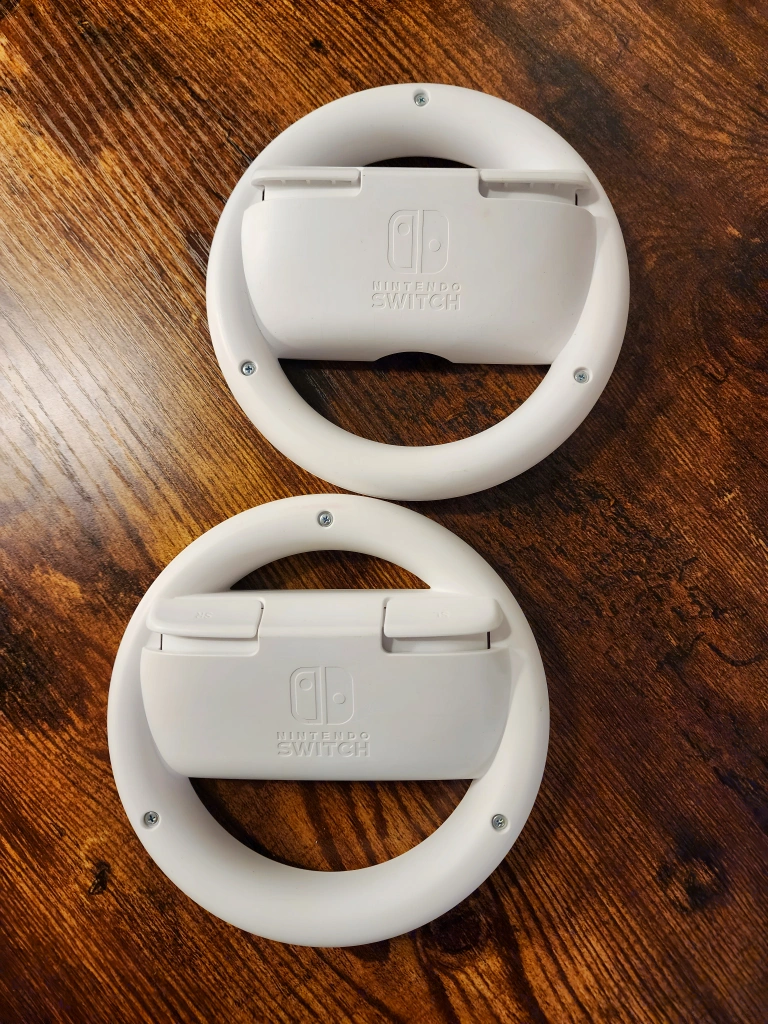 A set of 2 x Nintendo official steering wheels compatible with Nintendo Switch Joy-Con Controllers. Great for racing games like Mario Kart. Barely used, clean & ready for their next home ๐ ๐ฎ๐