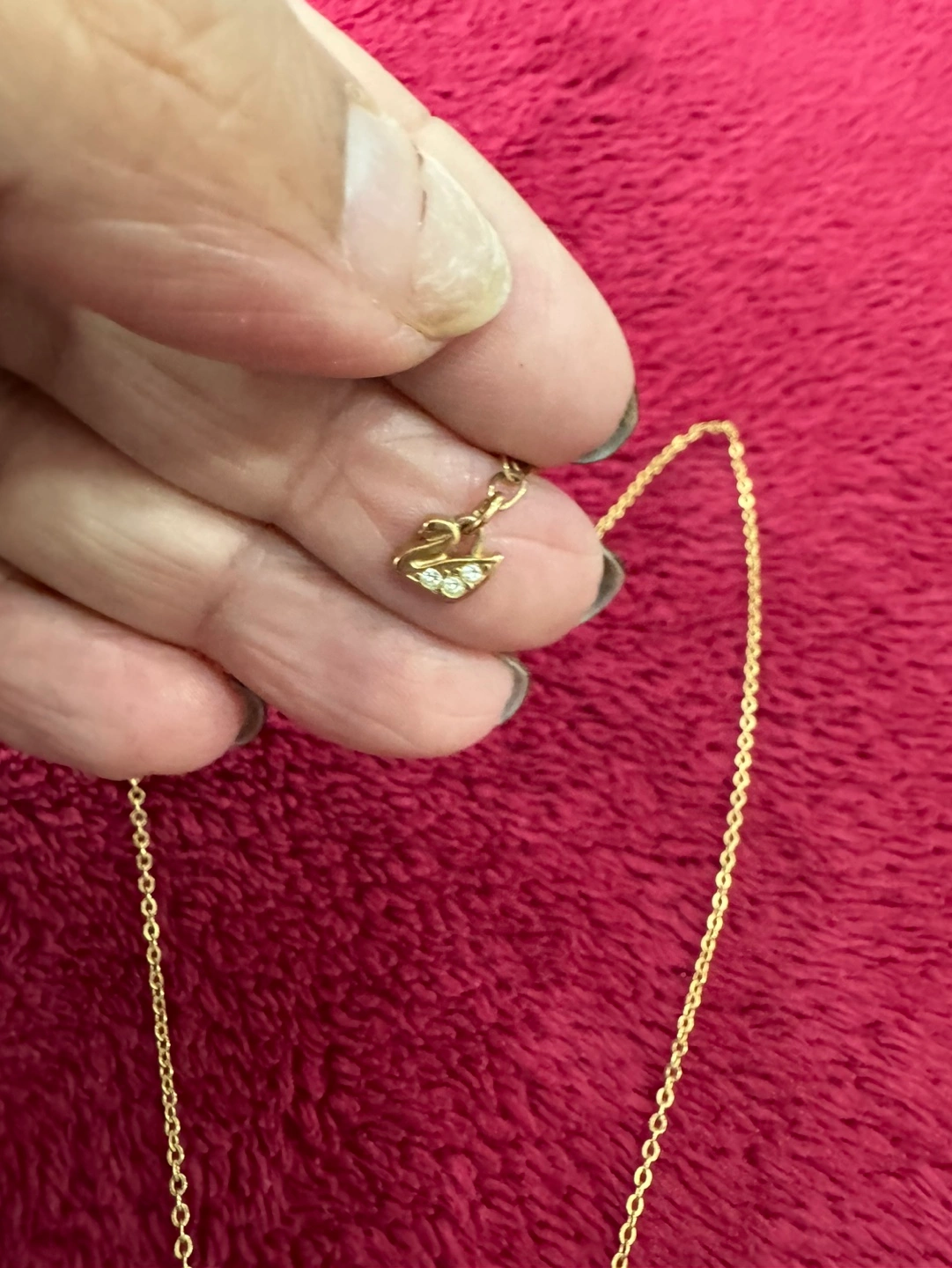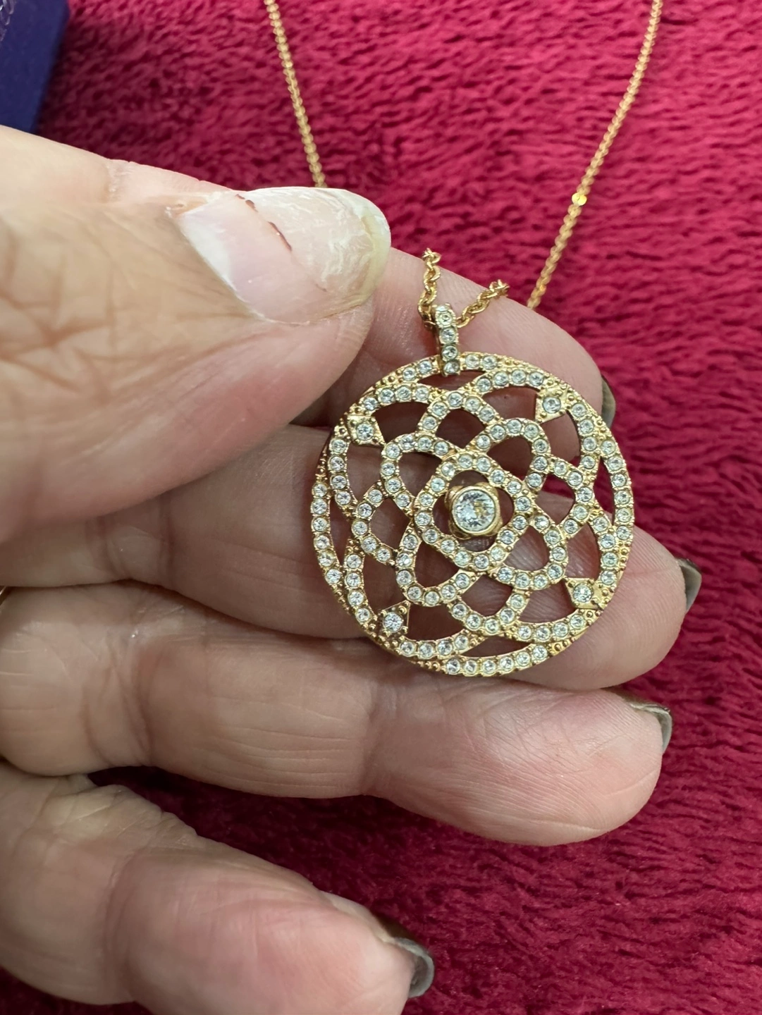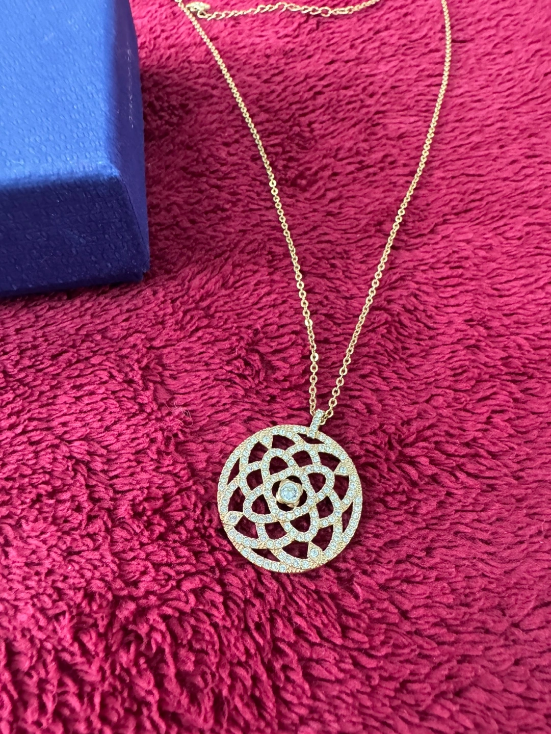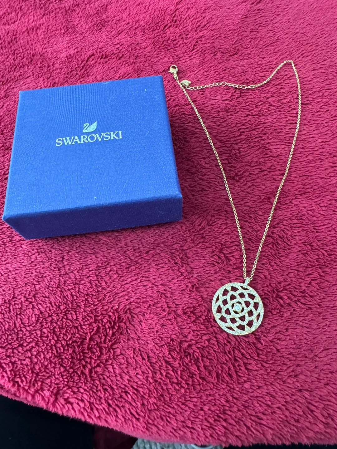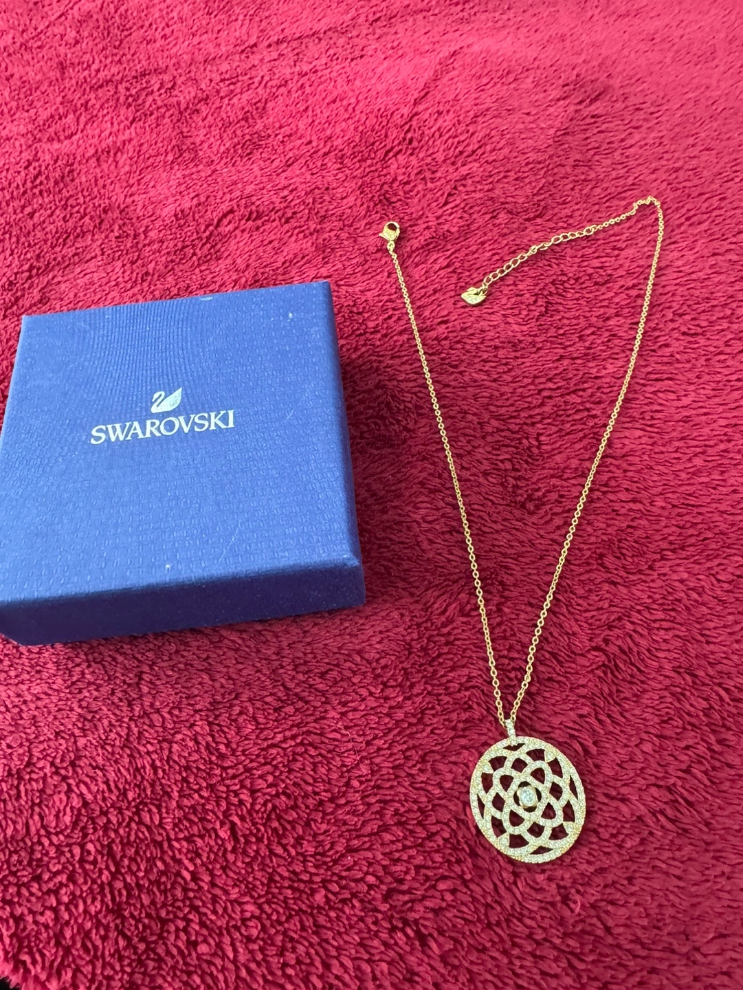 Gorgeous gold-tone necklace. Features a round mandala-style pendant encrusted with sparkling crystals. Delicate chain with a swan clasp. Comes in original Swarovski box.