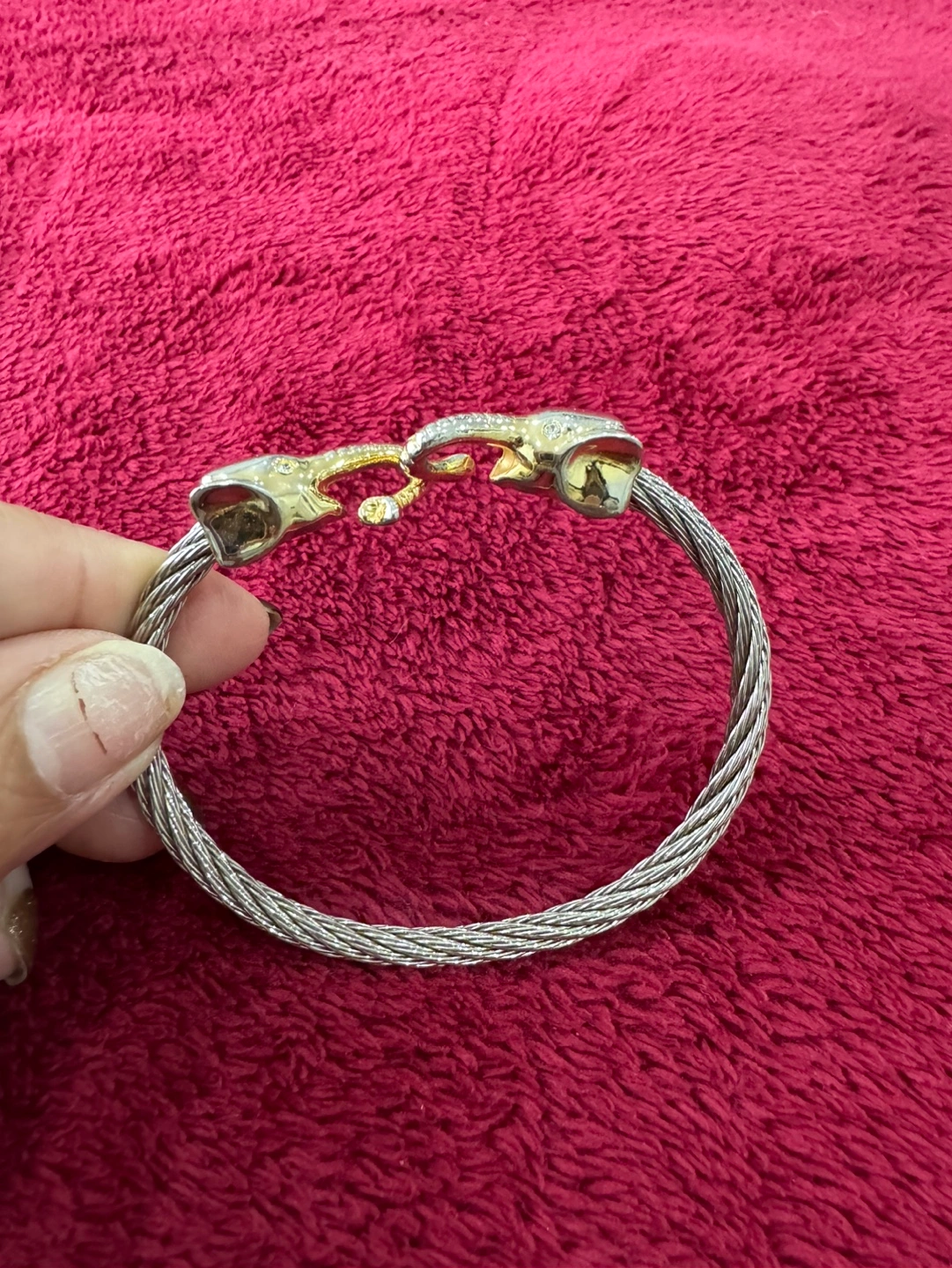 Beautiful cable bracelet. Features two elephant heads. Gold and silver tones. Clasp closure. Pre-owned.10$ each