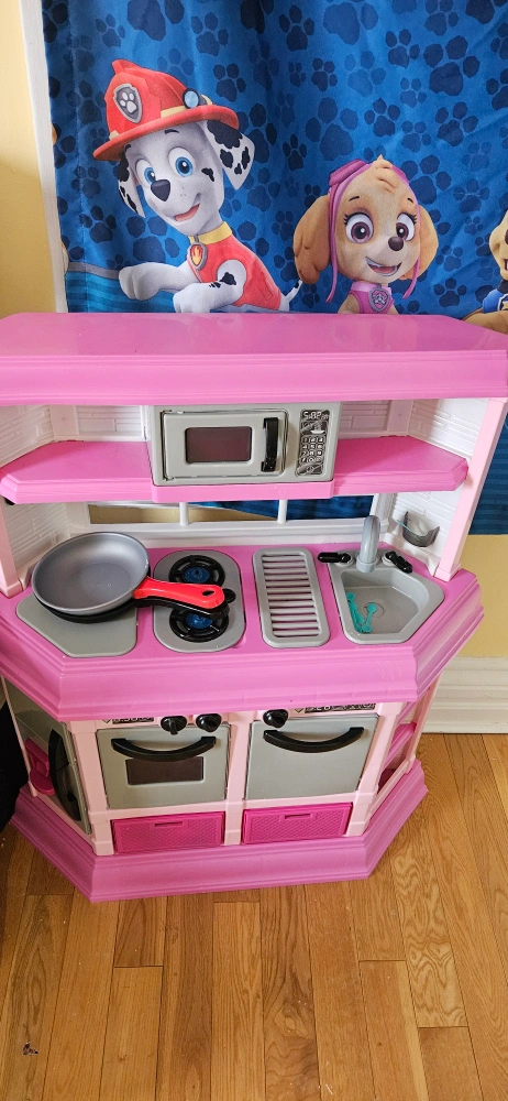 Adorable pink play kitchen. Features a microwave, stovetop, sink, and oven. Includes a frying pan. Great for imaginative play.