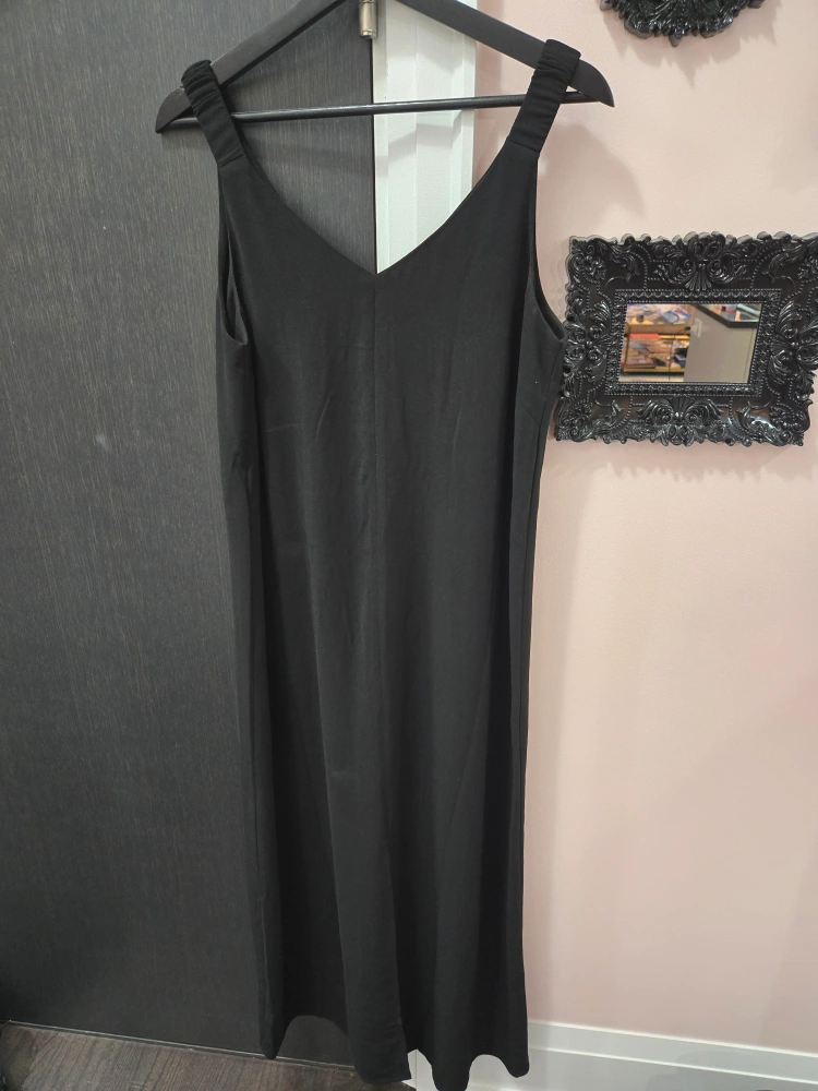 701Simple black maxi dress. Sleeveless with thin straps. V-neckline. Relaxed fit.
