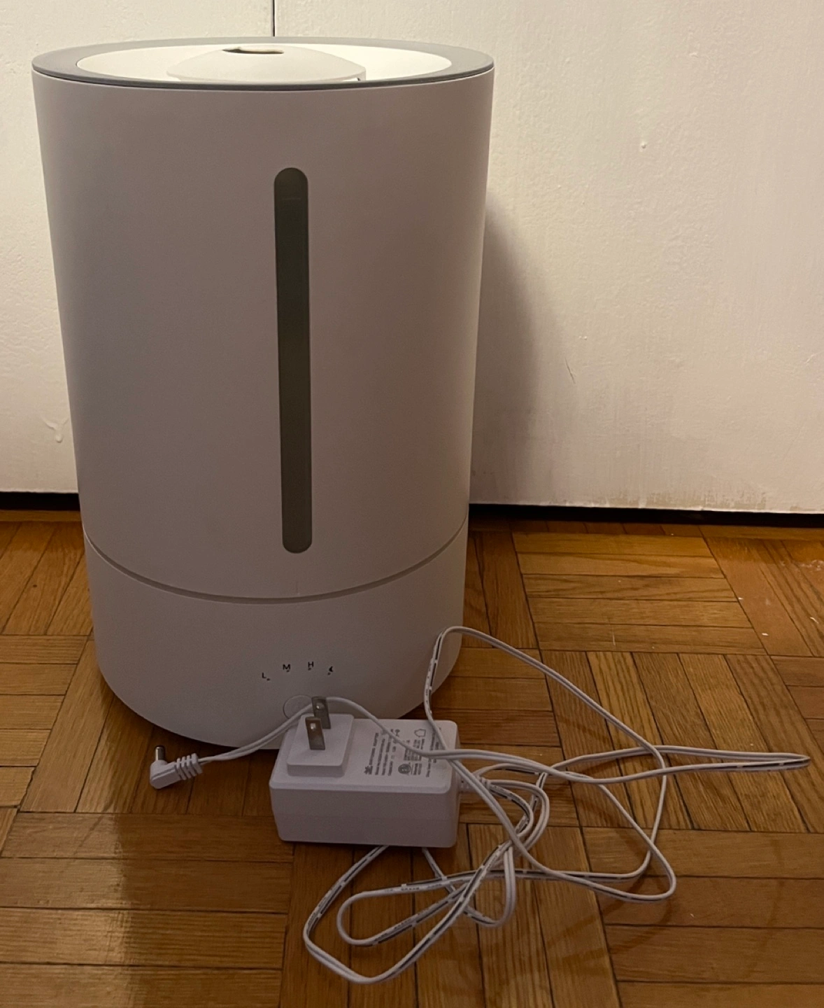 Large capacity humidifier. Three mist settings. Lights up. No filter required. White and grey colour. Includes power adapter. Used condition, some discolouration that may come off with vinegar/cleaning.
