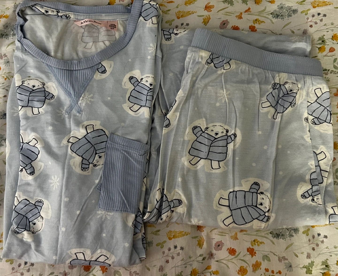 Adorable light blue pajama set. Features a cute polar bear design. Long sleeves and long pants. Soft and comfortable material. Size small.