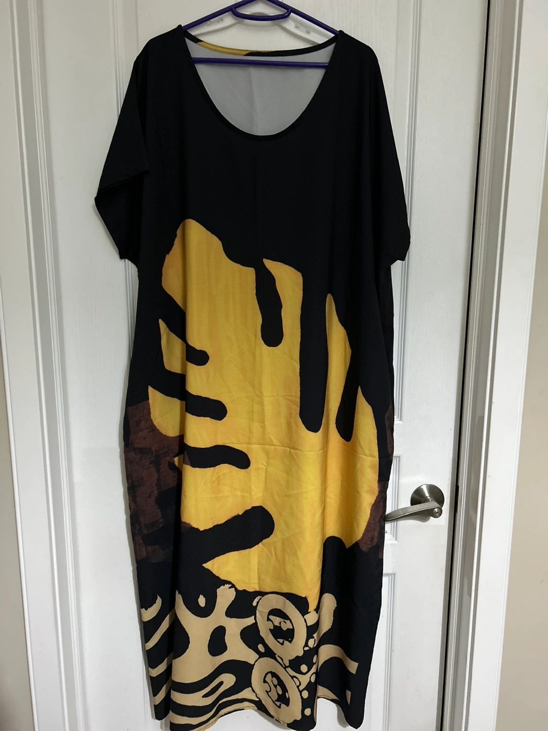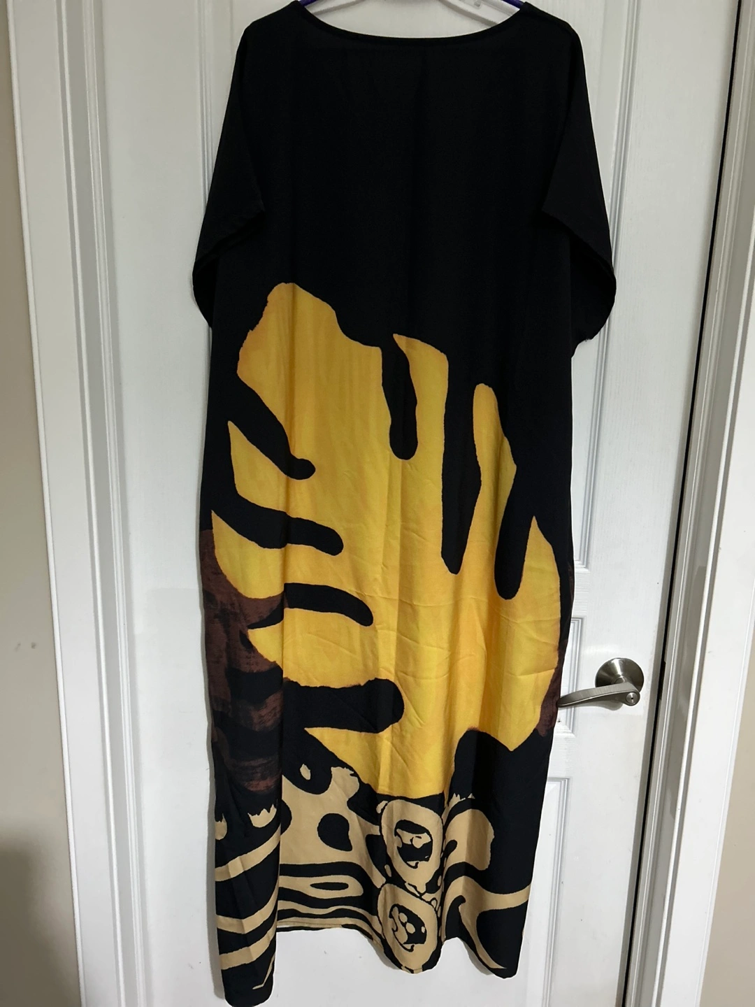 Flowy maxi dress. Kaftan, Short sleeves. Black background. Large yellow leaf print. Relaxed fit. Casual style. Comfortable material.
