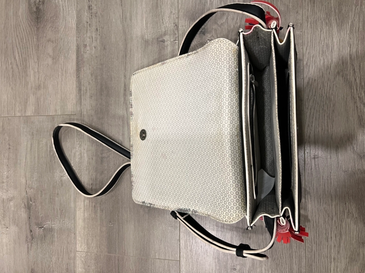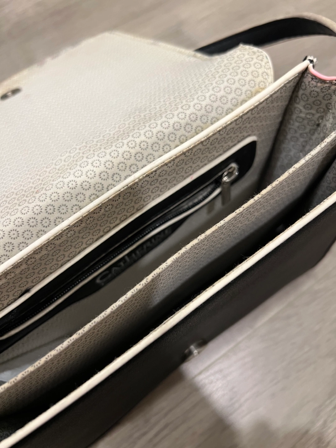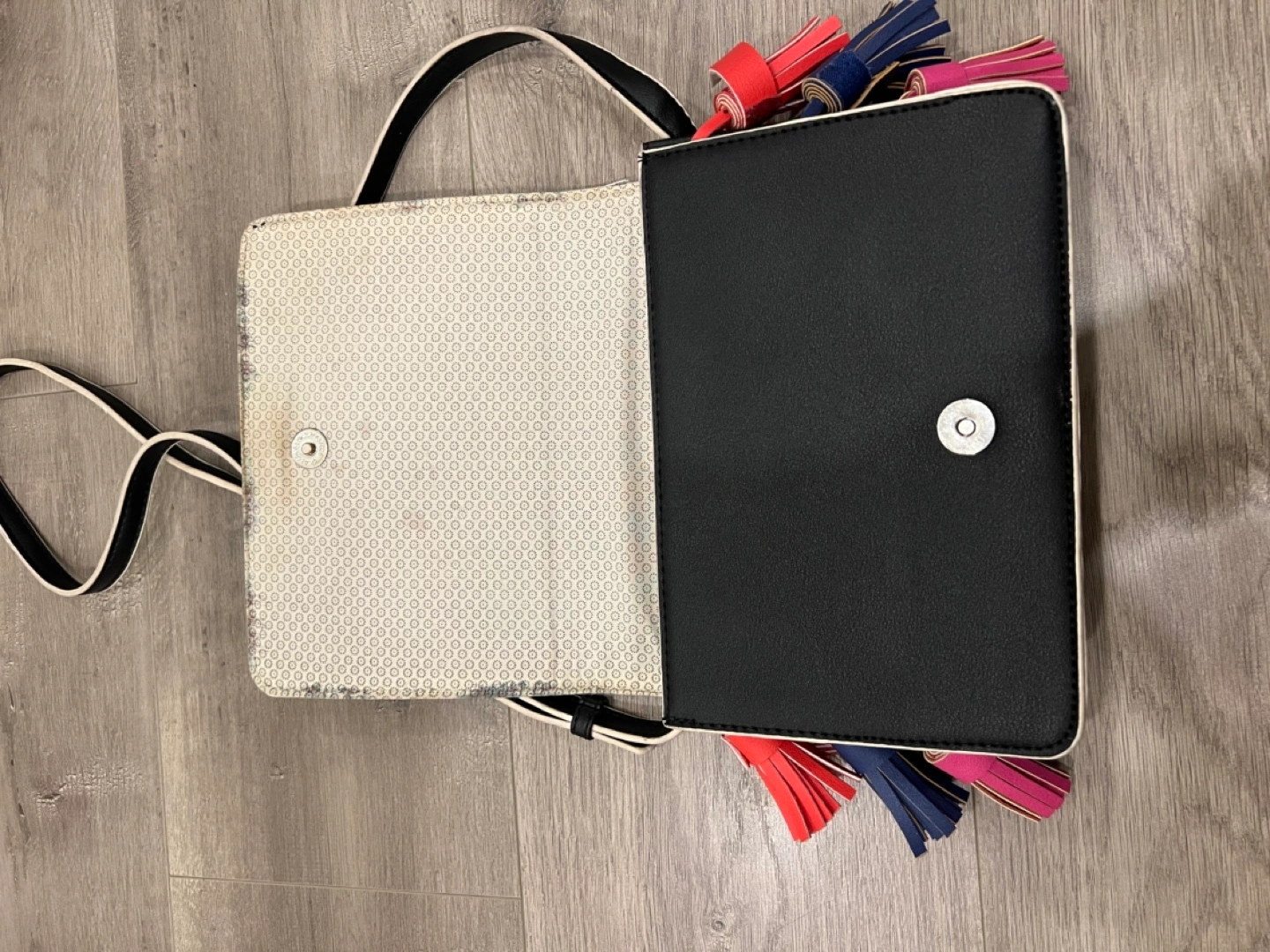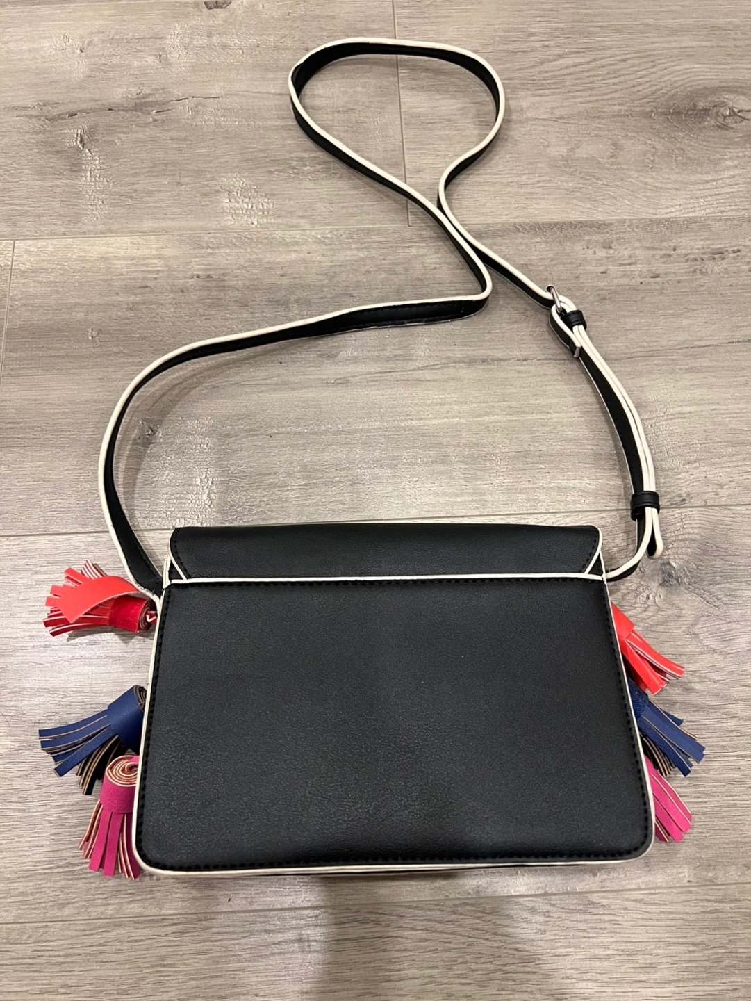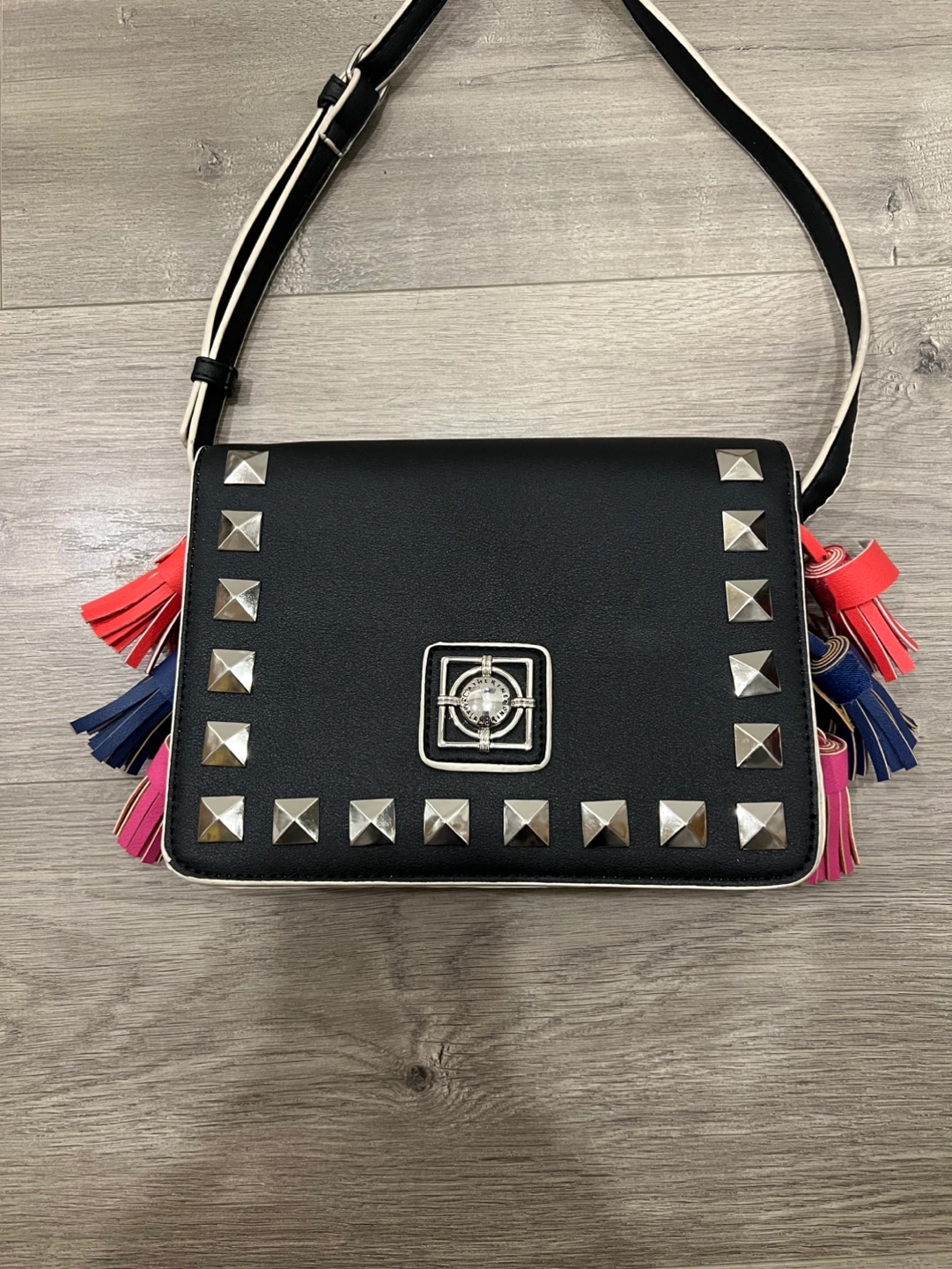 Stylish black crossbody bag by Cathrine Malandrino. Features silver-toned studs and colourful tassels. Adjustable strap. Small, ideal for everyday use.