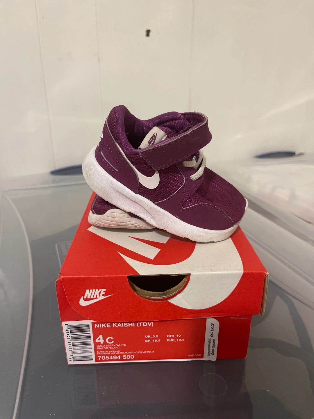 Purple Nike Kaishi TDV baby girl's shoes. Size 4C. In original box. Velcro closure. Better prices than Value Village! Better value than the dollar store! Practice sustainability. Check out other posts - if you want anything else, we can negotiate a bundle price. Pick Up Newtonbrook near Bathurst & Steeles CASH ONLY
