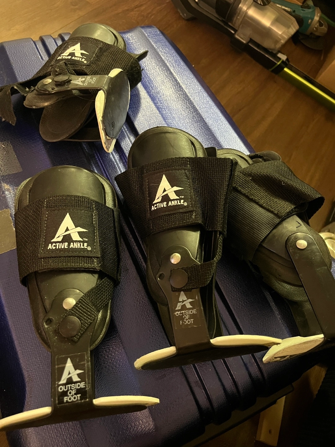 2 Pair a of Active Ankle supports. Black, adjustable straps. Marked for outside of foot.