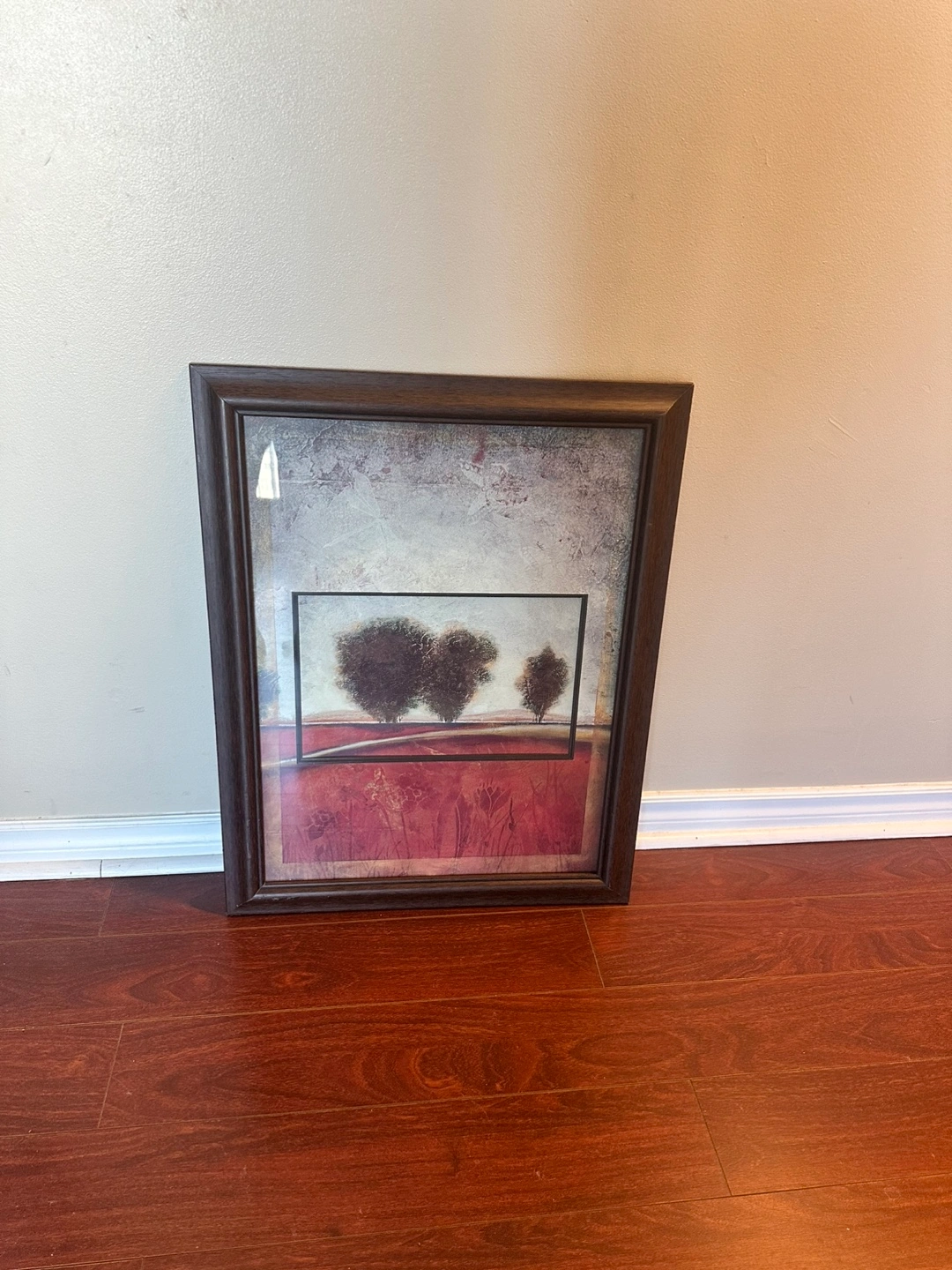 Beautiful framed art print. Features a landscape scene with trees and a field. Dark brown frame. Ready to hang.