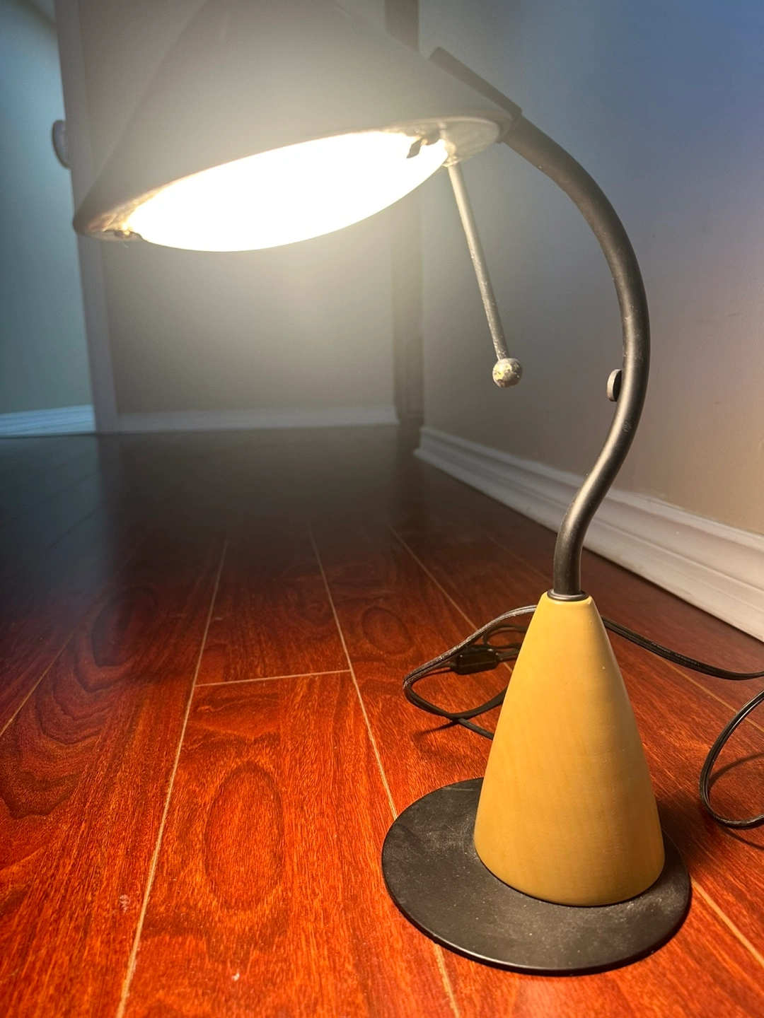 Functional desk lamp. Features a black shade and a beige base. Gooseneck design. Plugs into standard outlet.