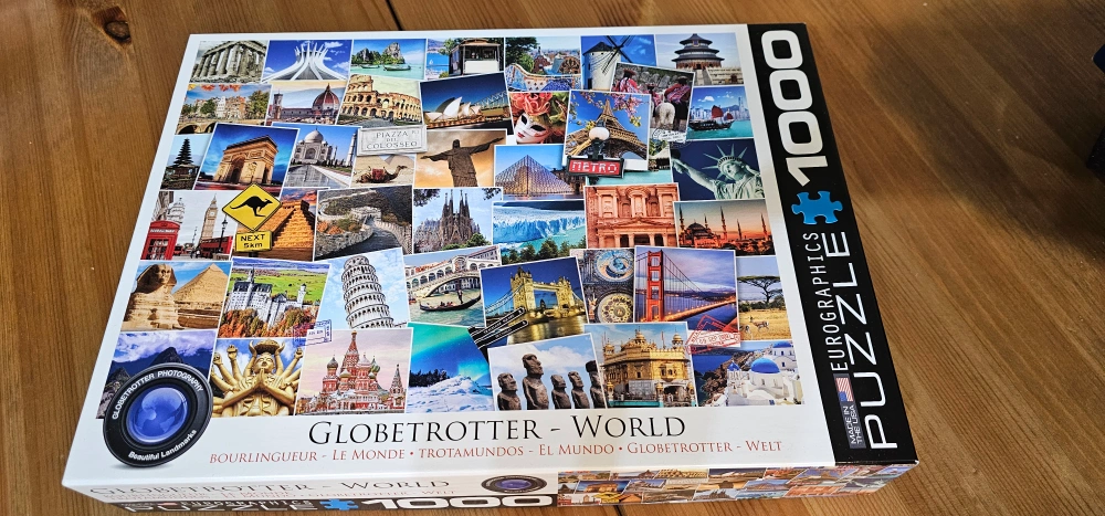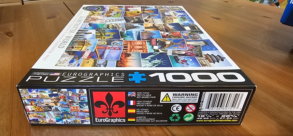 1000-piece jigsaw puzzle. Images of world landmarks. Like new, in box. Made in the USA.