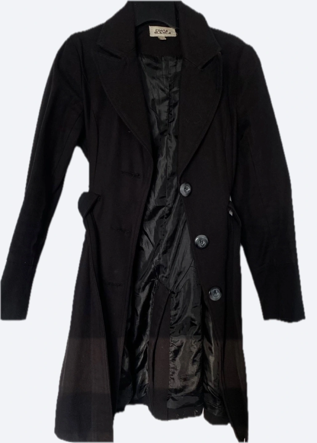 Worn only twice, Women's black peacoat. Long sleeves, button closure, belted waist. Classic style