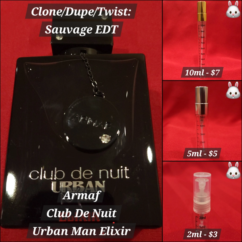 Armaf Club De Nuit Urban Man Elixir. Sauvage EDT clone. Available in 2ml, 5ml, and 10ml sizes.