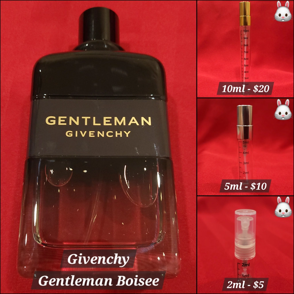 Givenchy Gentleman Boisee decants available. Choose from 2ml, 5ml, or 10ml sizes. Prices vary.
